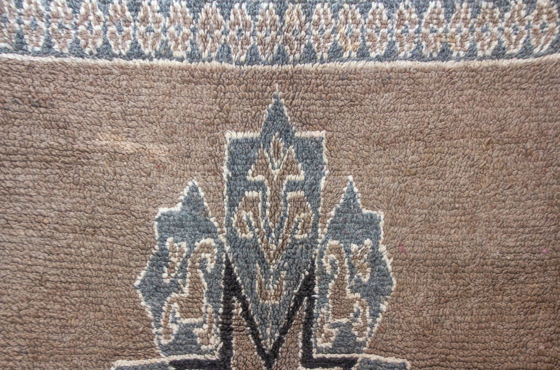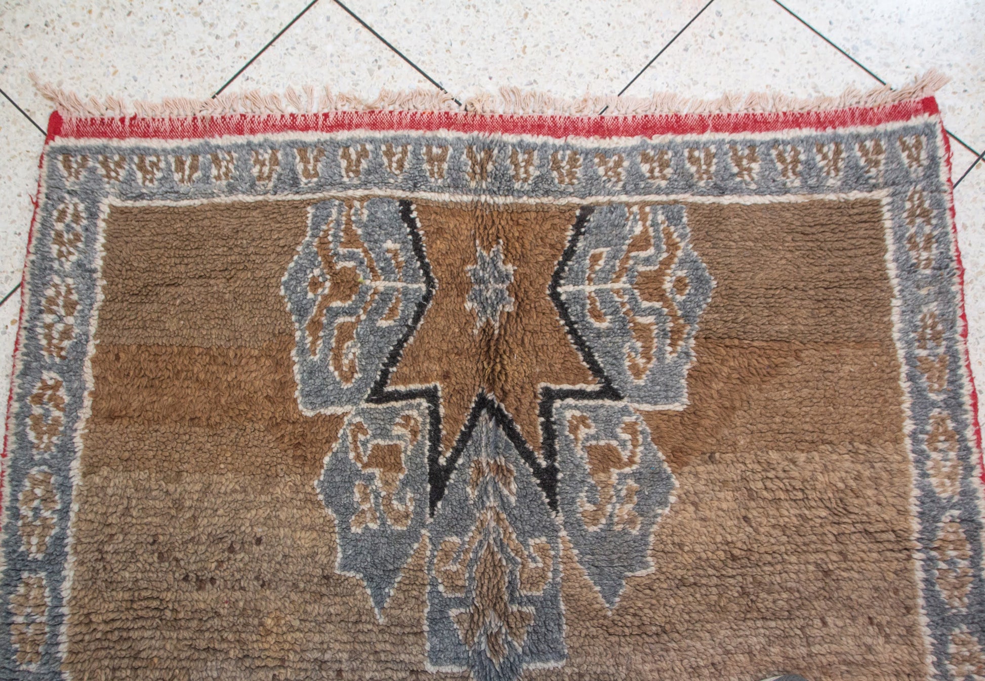 سجادة آيت زيان مميزة من الأطلس المتوسط، منسوجة بمهارة عالية ميدالية نجمة مركزية محاطة بزخارف عاكسة ومحاطة بإطار منقوش. بألوان بنية ترابية مع لمسات زرقاء نيلي، يعكس التصميم التقاليد الأمازيغية التناظر، والحراسة، والنظام الكوني.