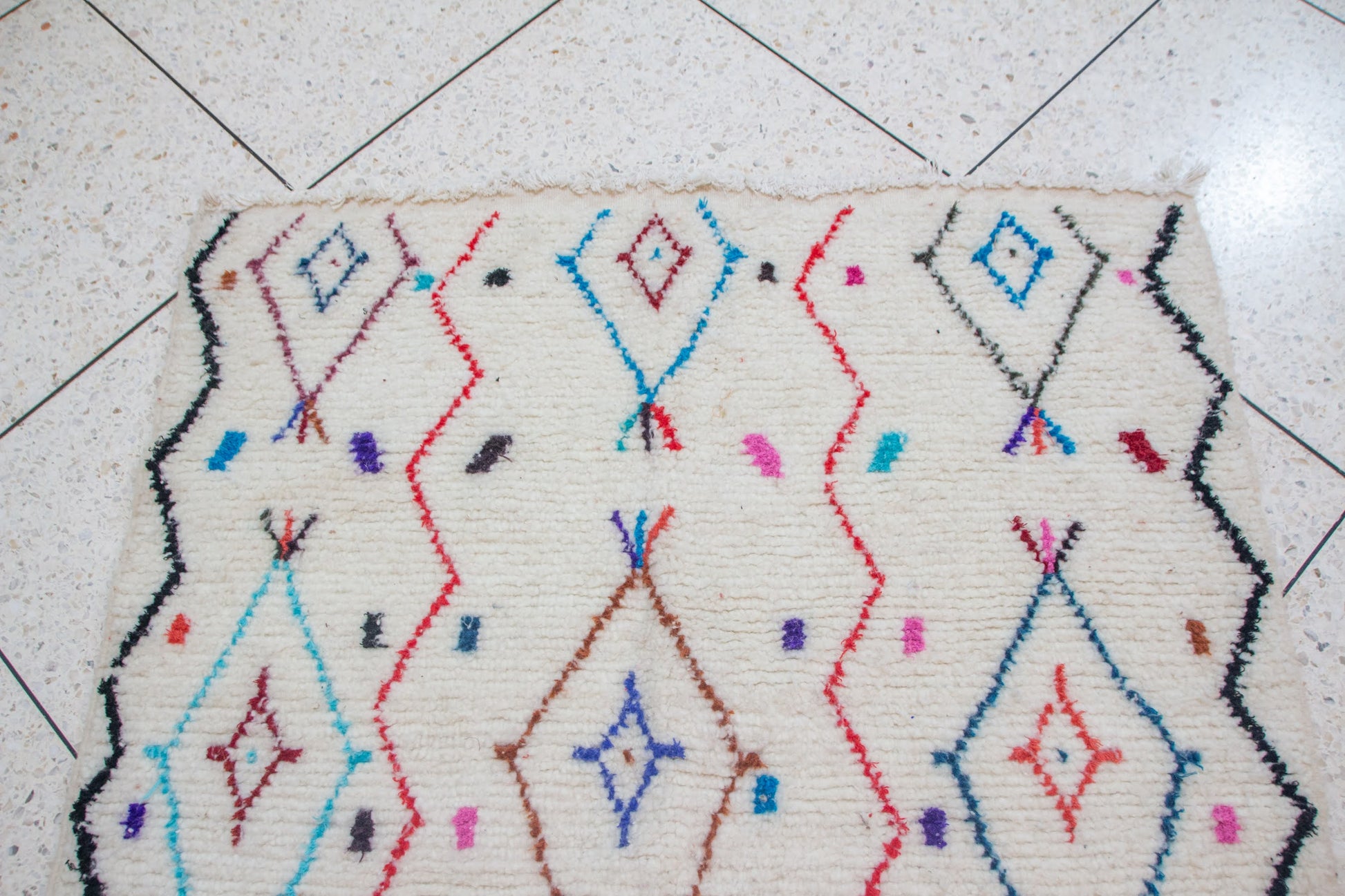 سجادة أزيلال رائعة من الوبر على أرضية عاجية دافئة، متحركة بشبكة عمودية من ميداليات المعينات بألوان الأحمر والنيلي والفيروزي والوردي والترابي. حوافها المتدرجة غير المتماثلة تأطير الميدان بإيقاع حيوي - قطعة أصلية من High Atlas.