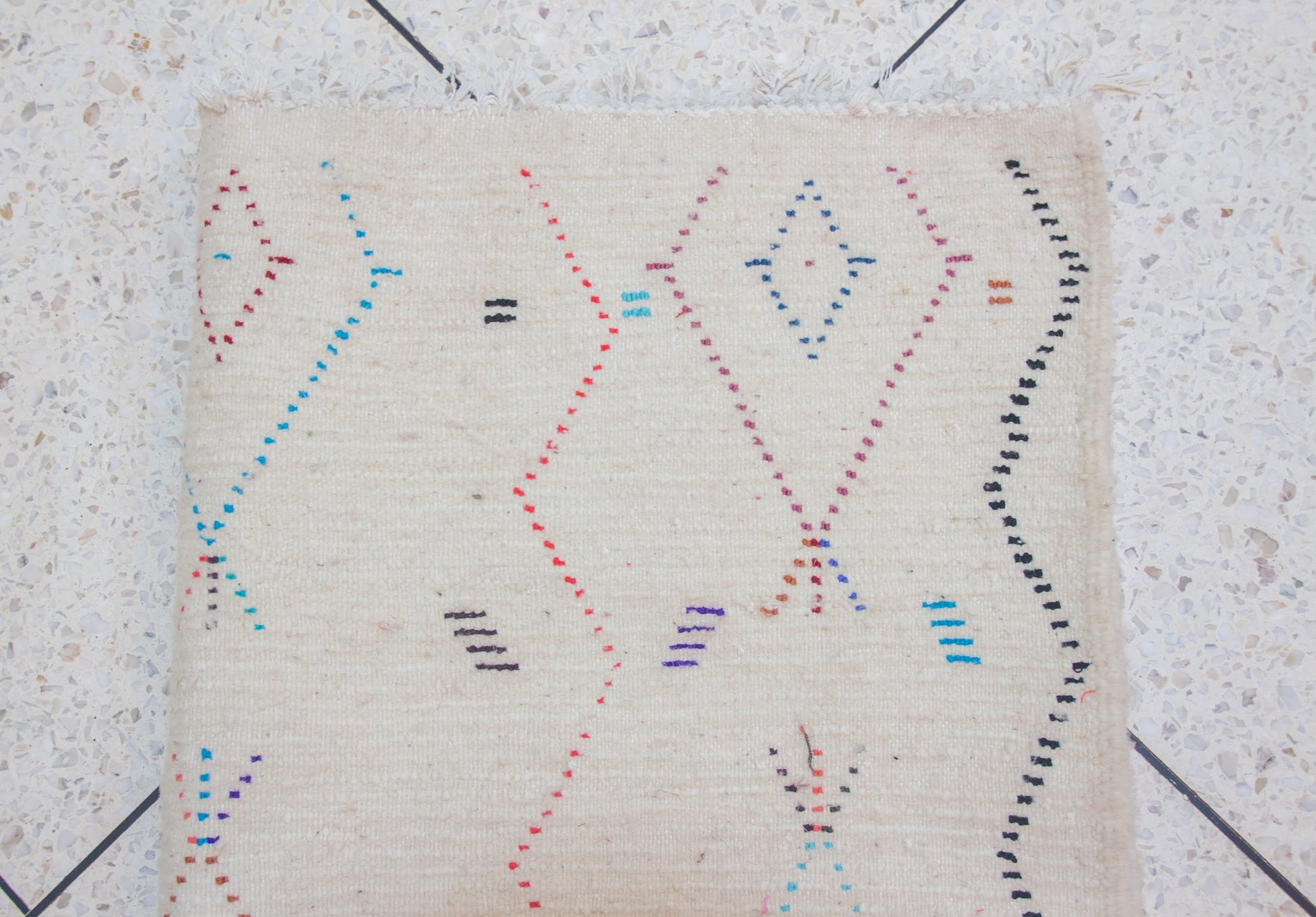 This rug is an original sample from our weaving workshop. Every stitch is handcrafted using undyed or plant-dyed wool sourced from the Atlas. The motifs, symbols, and size can all be reimagined to reflect your own vision.