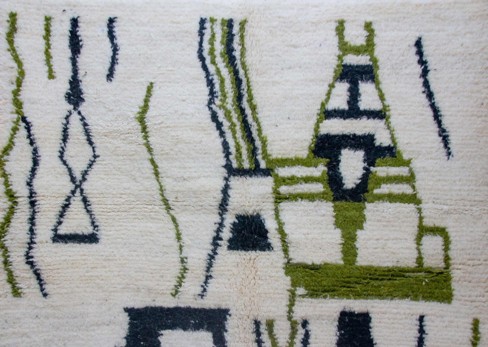 تركيبة معاصرة من أزيلال على صوف عاجي دافئ، متحرك بزخارف طوطمية أشكال، ورموز معينة، وخطوط عمودية متعرجة باللونين الأخضر الزيتوني والأسود الفحمي. يحافظ الرسم على الطاقة العفوية لنسيج الأطلس الكبير مع الإشارة إلى الرمزية الأمازيغية من الوصاية، والصعود، وتدفق الحياة.