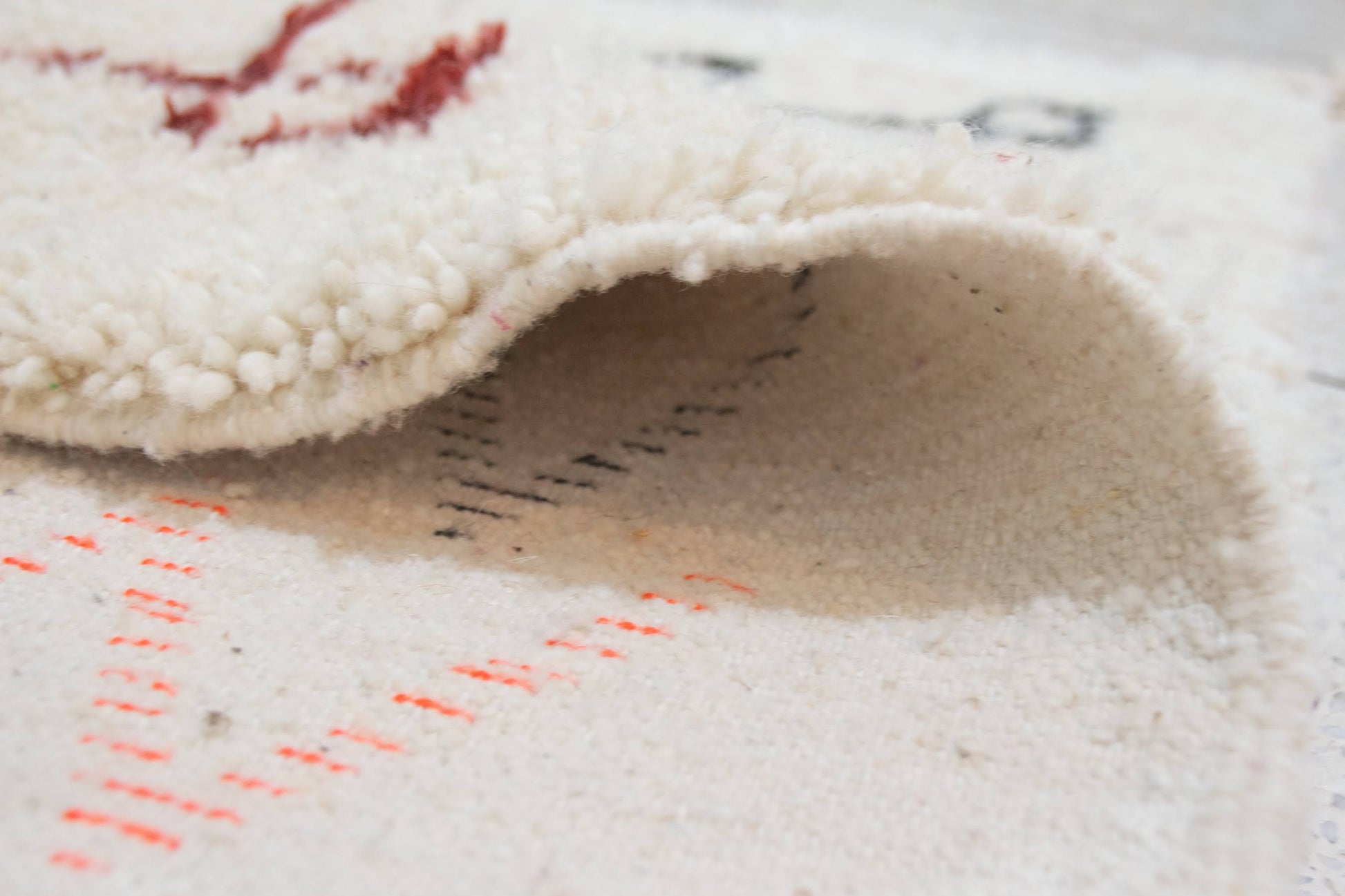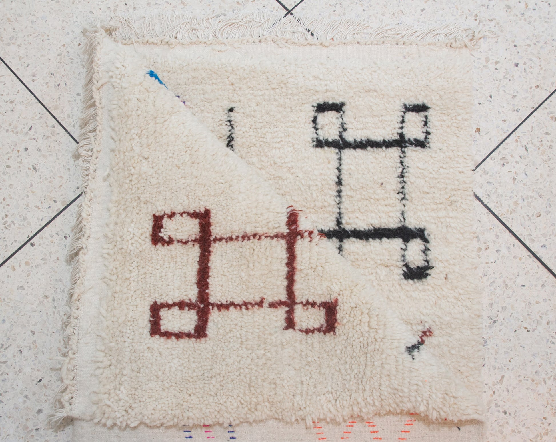 This rug is an original sample from our weaving workshop. Every stitch is handcrafted using undyed or plant-dyed wool sourced from the Atlas. The motifs, symbols, and size can all be reimagined to reflect your own vision.