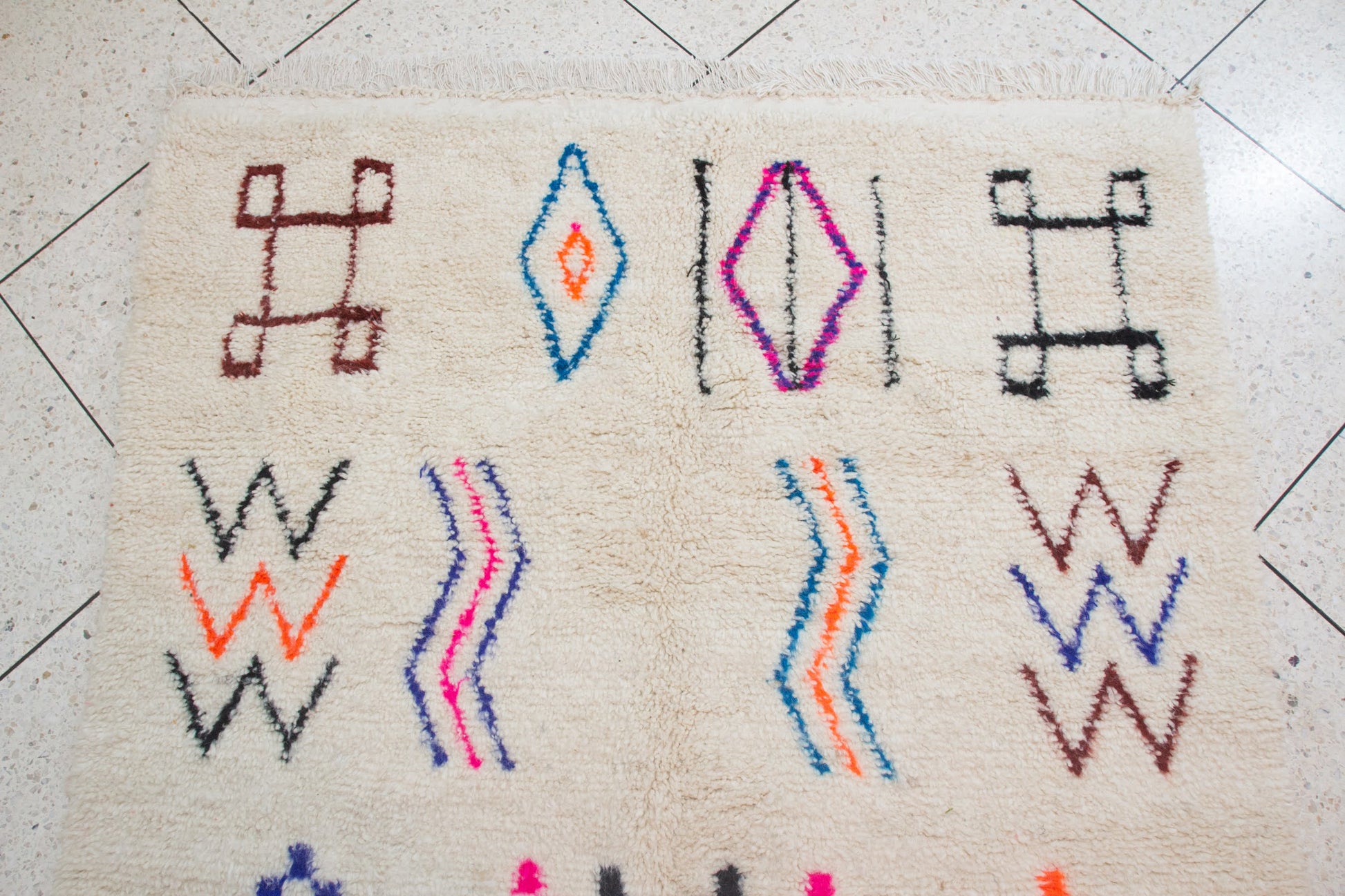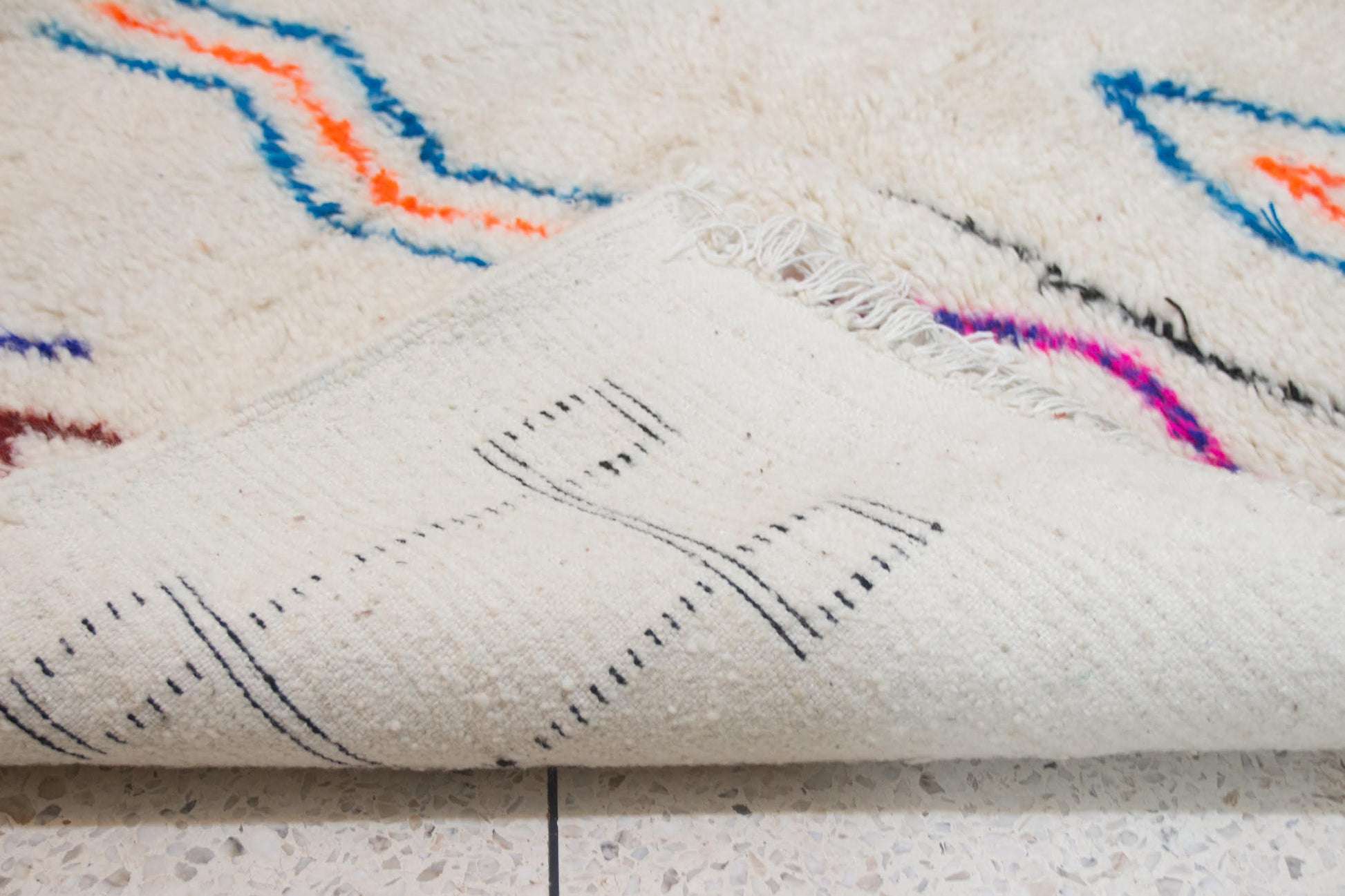 أزيلال معقود يدويًا من أطلس المغرب الكبير. على أرضية عاجية هادئة، مجموعة من الزخارف تتكشف - معينات، قمم متدرجة على شكل حرف "M"، أعمدة متعرجة، صلبان مؤطرة، وأشكال متعرجة منقطة - مرسومة باللون الأرجواني، كوبالتي، أزرق مخضر، برتقالي، شوكولاتة، وفحم. رموز مرحة، توازن كلاسيكي.