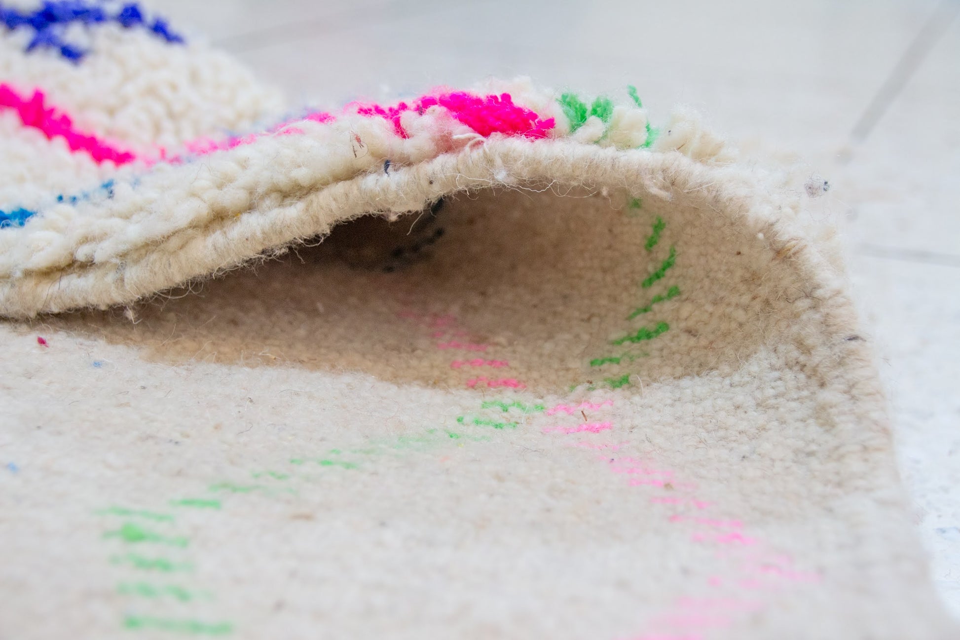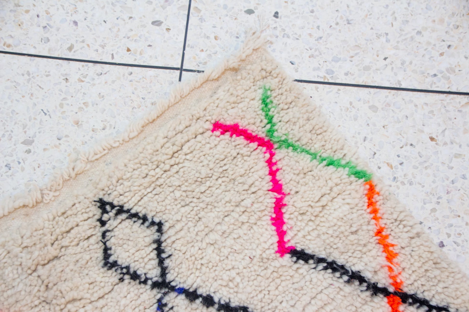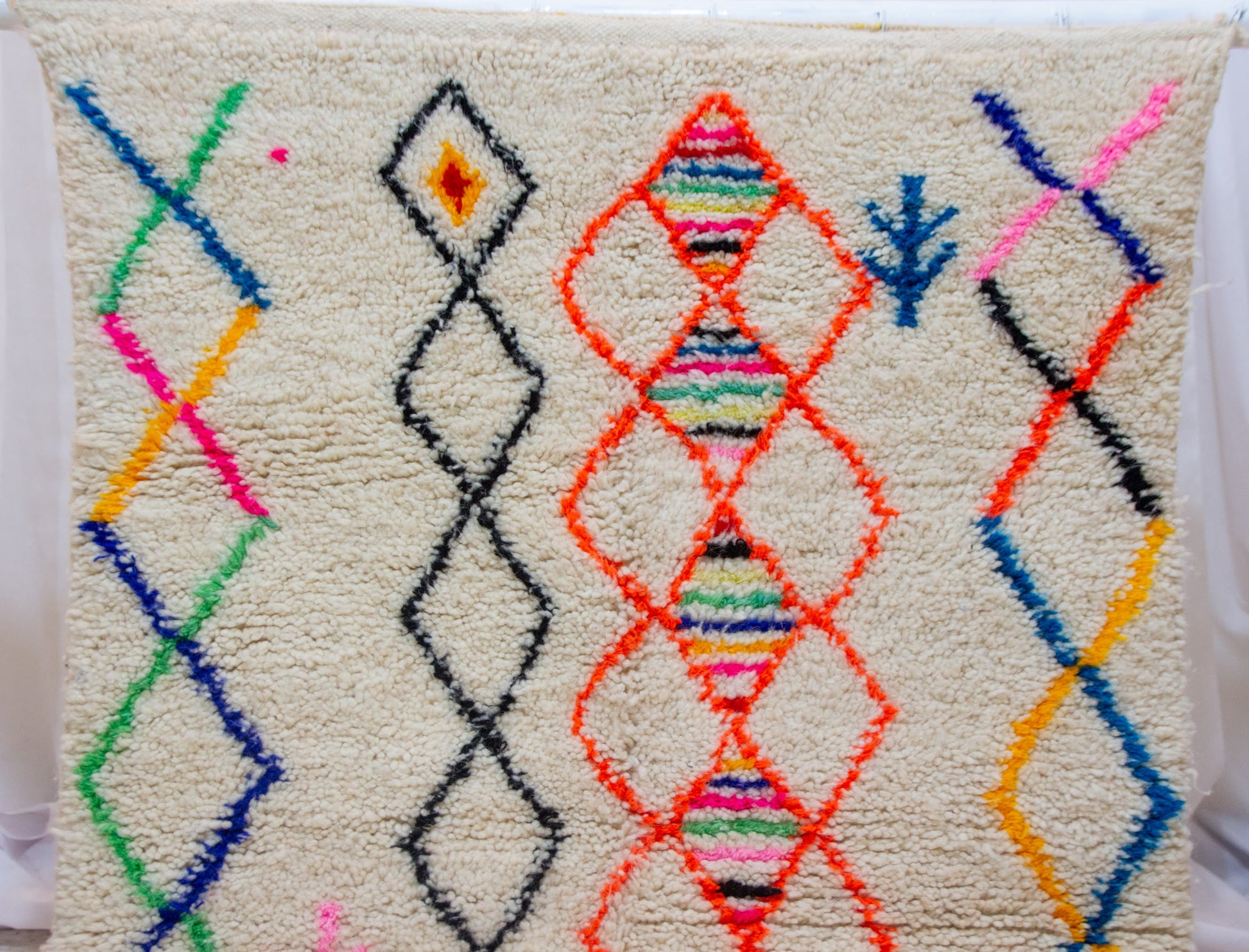 نسج أزيلال جريء على شكل مربع واسع. حقل العاج مُهيكل من خلال سلاسل عمودية من المعينات بألوان نيون زاهية - برتقالي، وأخضر، ووردي، وكوبالت، وأشرطة مخططة بألوان قوس قزح - بالتناوب مع خطوط سوداء ونيلي دقيقة. تصميم أطلسي مضيء يدمج الهندسة مع الحداثة المرحة.