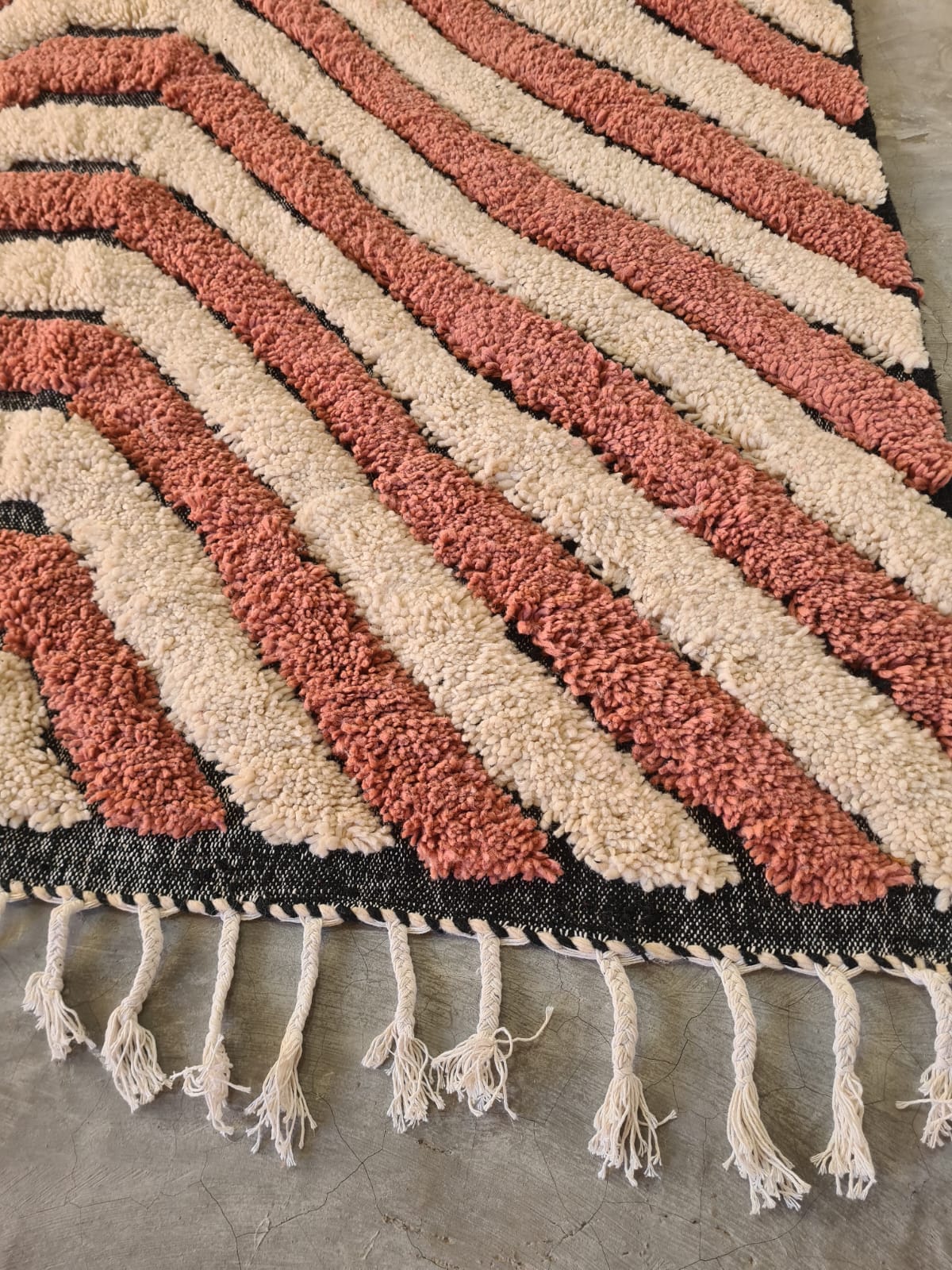 "مسارات النول" قطعةٌ من المرموشة المنسوجة يدويًا من جبال الأطلس المتوسط، هندستها متاهةٌ حية من الألوان والرموز. تتداخل خطوطٌ قطريةٌ متعرجةٌ من الأحمر المرجاني والنيلي الداكن على قاعدةٍ من الصوف الطبيعي، مستحضرةً رموز الملاحة الأمازيغية القديمة والتجوال الروحي لرحلات الصحراء.