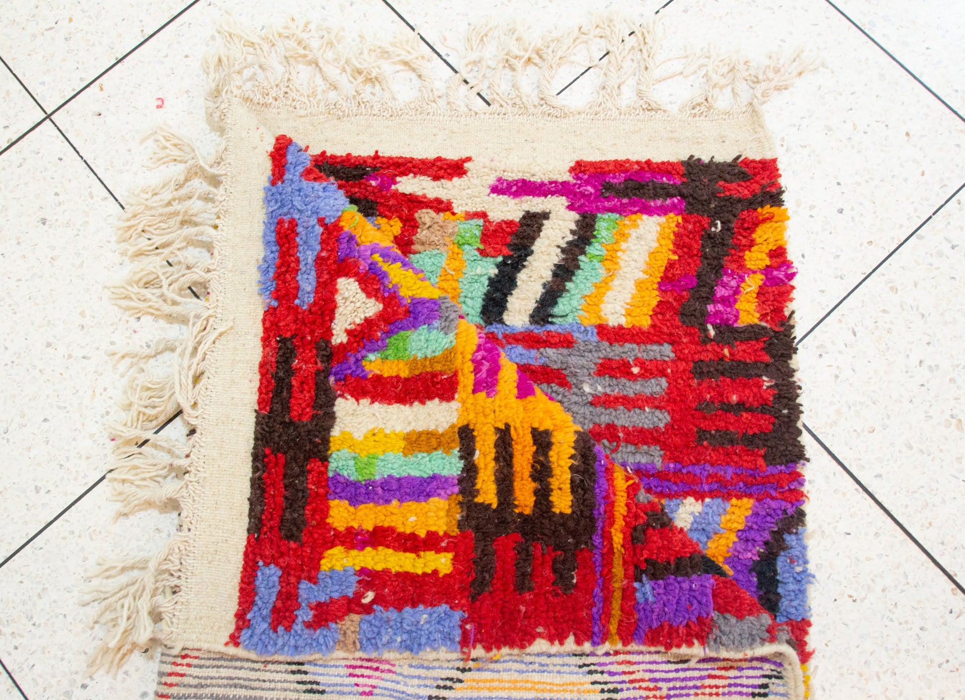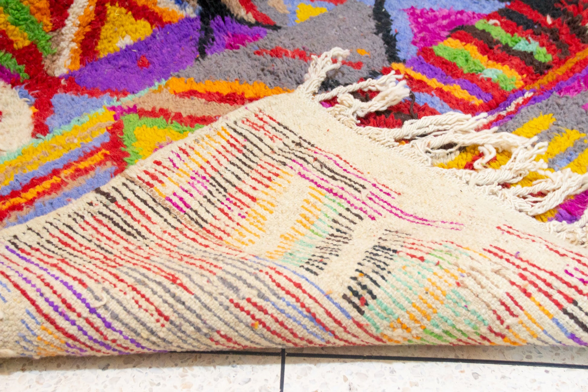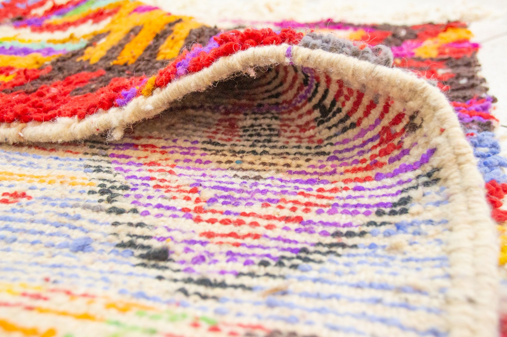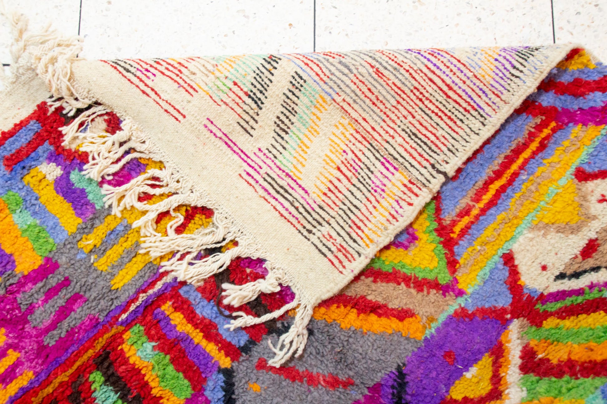 بوجاعد يدوي الصنع من أطلس المغرب الأوسط. حقلٌ مُبهجٌ ينفتح أفقيًا سجلات الألوان - الأشكال المتدرجة، والكتل، والخطوط الشبيهة بالشرائط - تتحرك عبر اللون الأزرق المخضر، والكوبالت، زمرد، زعفران، قرمزي، بنفسجي، ومشمش. مهرجانٌ للهندسة الأمازيغية مُجسّدٌ بالصوف الفاخر.