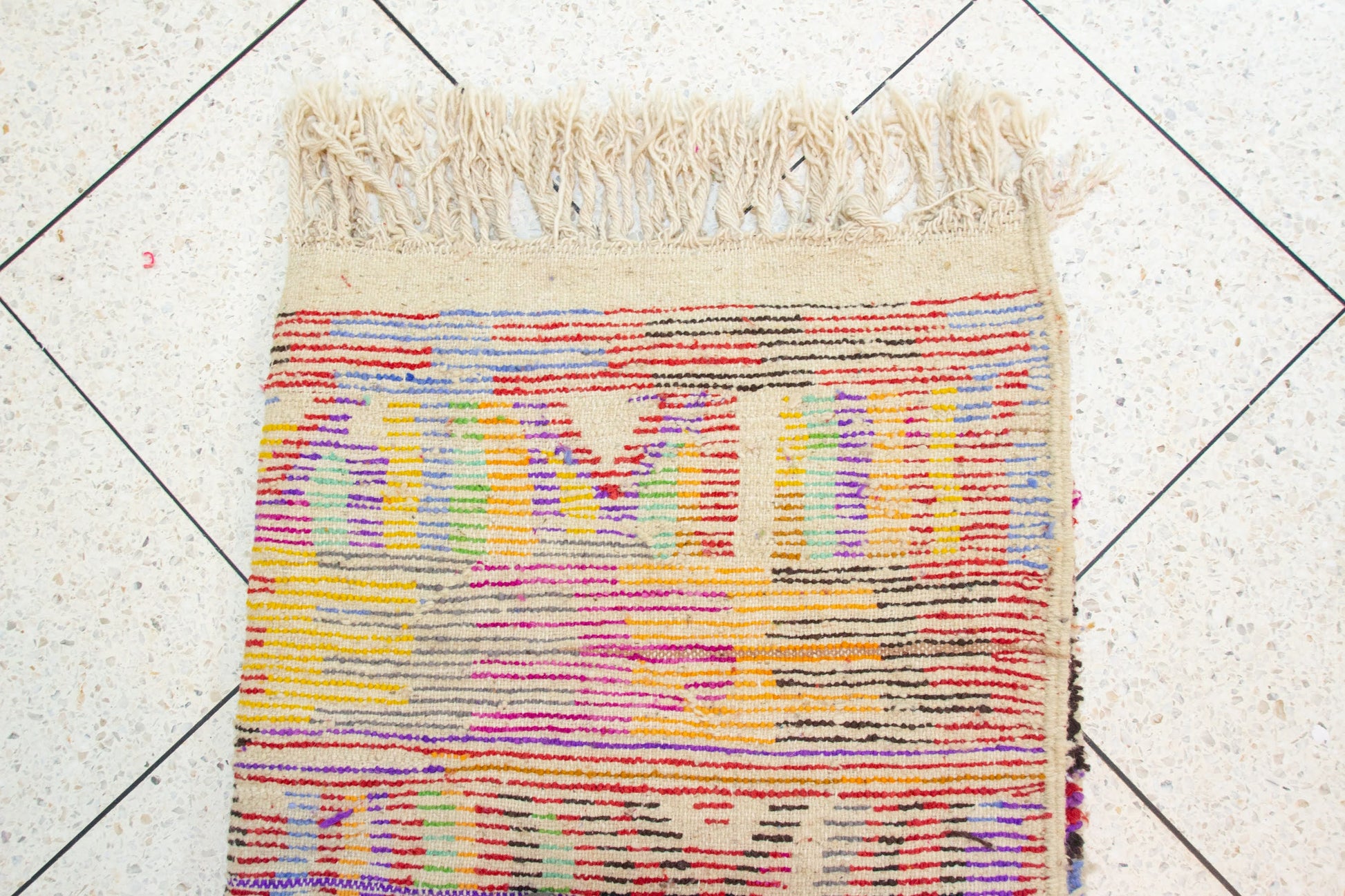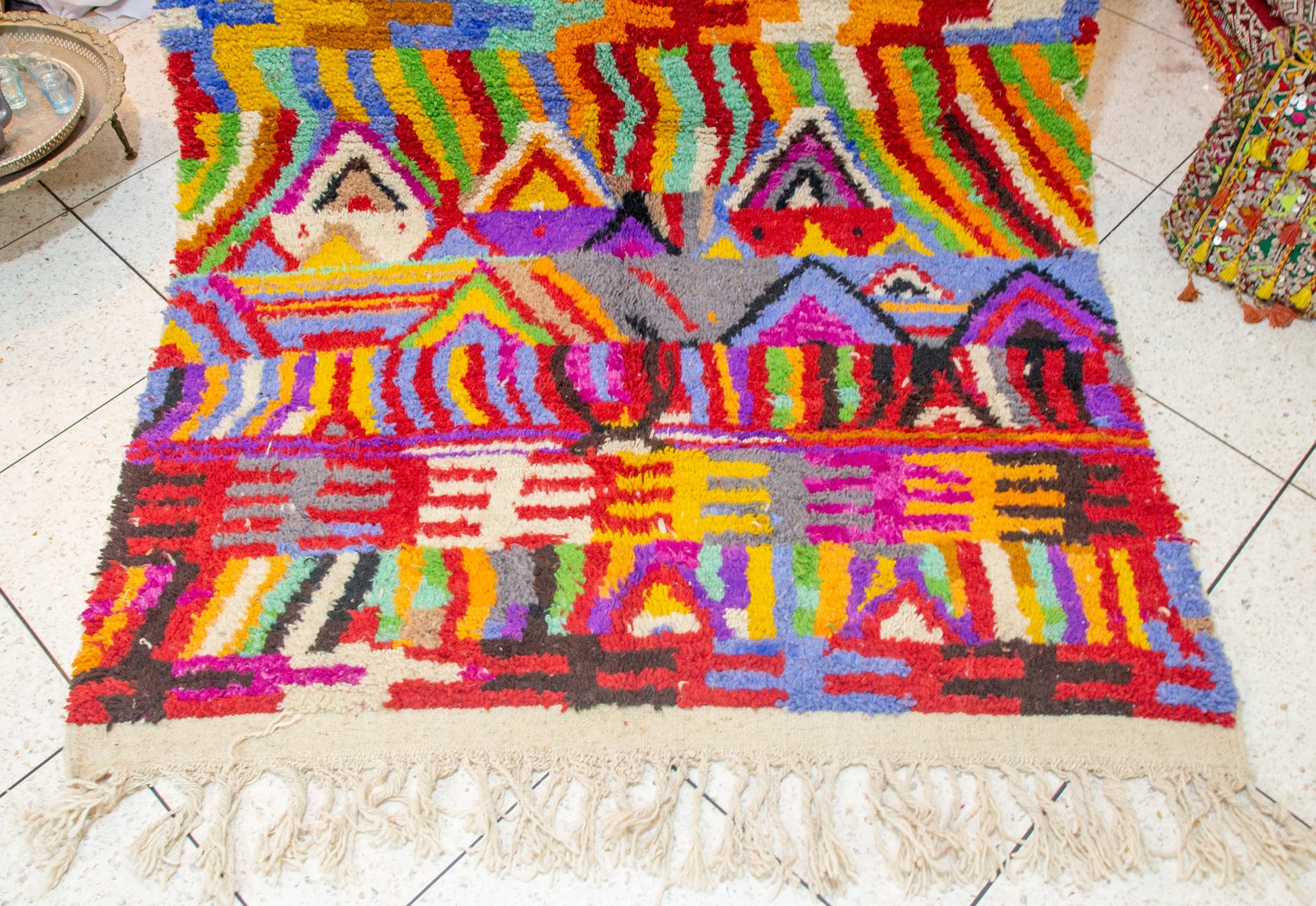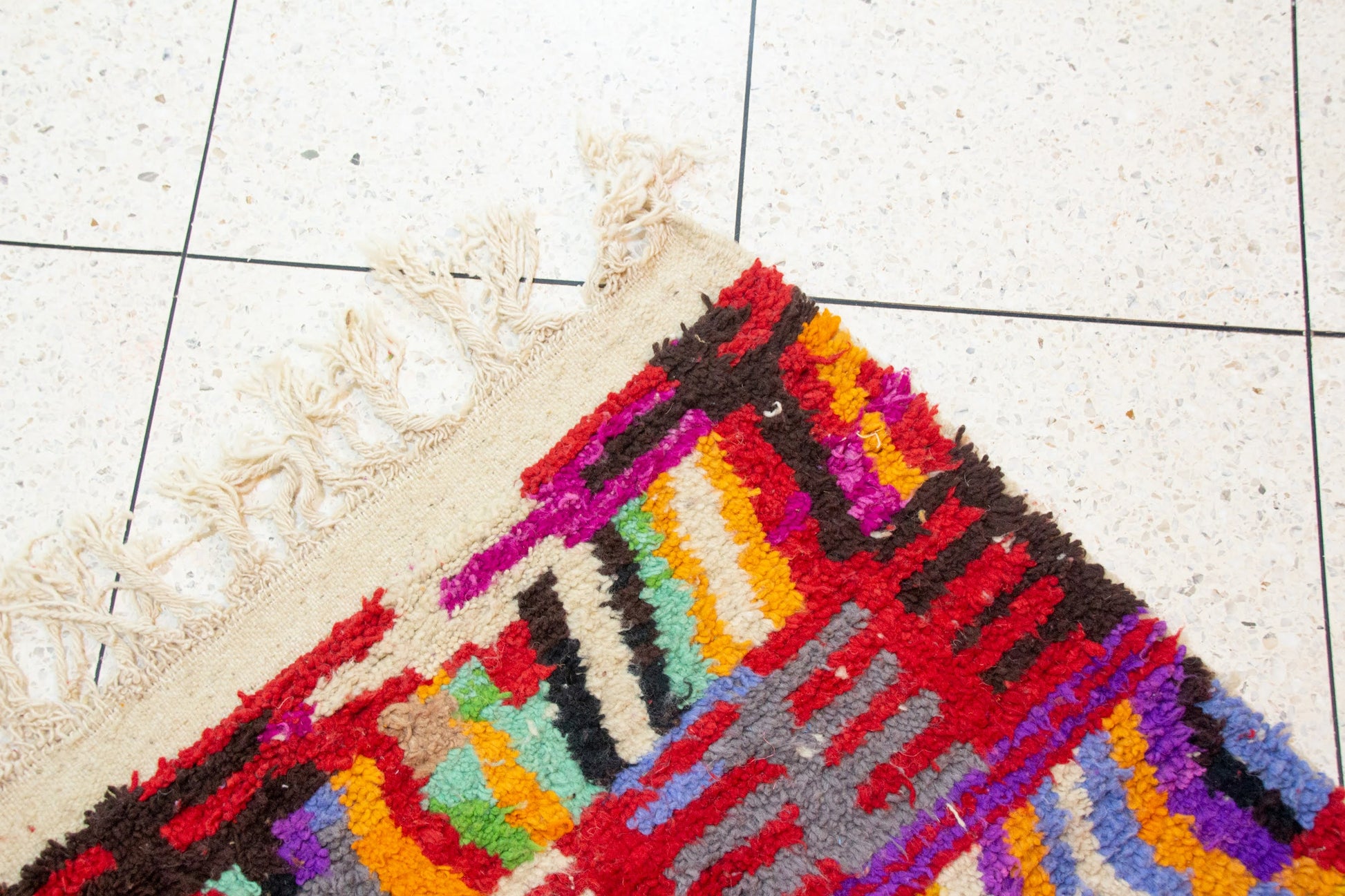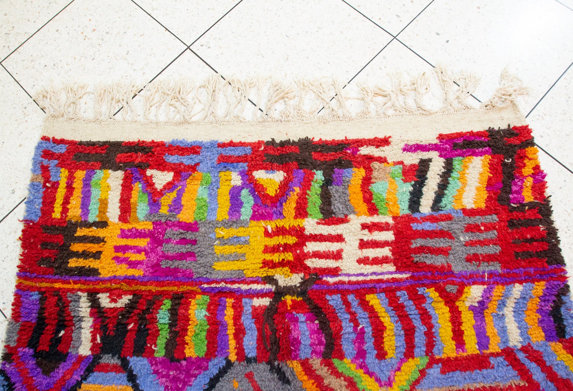 بوجاعد يدوي الصنع من أطلس المغرب الأوسط. حقلٌ مُبهجٌ ينفتح أفقيًا سجلات الألوان - الأشكال المتدرجة، والكتل، والخطوط الشبيهة بالشرائط - تتحرك عبر اللون الأزرق المخضر، والكوبالت، زمرد، زعفران، قرمزي، بنفسجي، ومشمش. مهرجانٌ للهندسة الأمازيغية مُجسّدٌ بالصوف الفاخر.