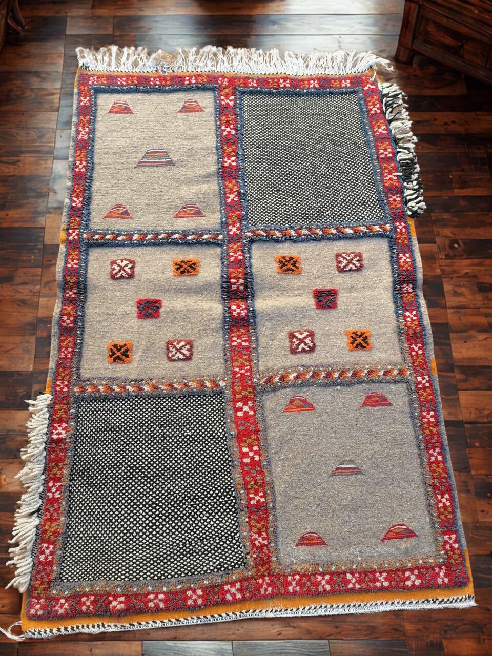 هذا الكليم الجلاوي المنسوج يدويًا في ممر تازناخت/سيروا، يقسم حقلًا رماديًا ناعمًا إلى ستة ألواح: قسمين من رقعة الشطرنج ذات الألوان الجوهرية، وكتلتان من التعويذات مطرزتان بالورود، ولوحتان على شكل "عين/قارب". إطار زهري قرمزي وحراس من الجينز النيلي يؤطرون التركيبة؛ وتشطيبات هامشية قصيرة ملتوية يدويًا تكمل الأطراف. منخفض الارتفاع ومتين - مثالي تحت كراسي الطعام، وفي غرف المعيشة، أو فوق السيزال.
