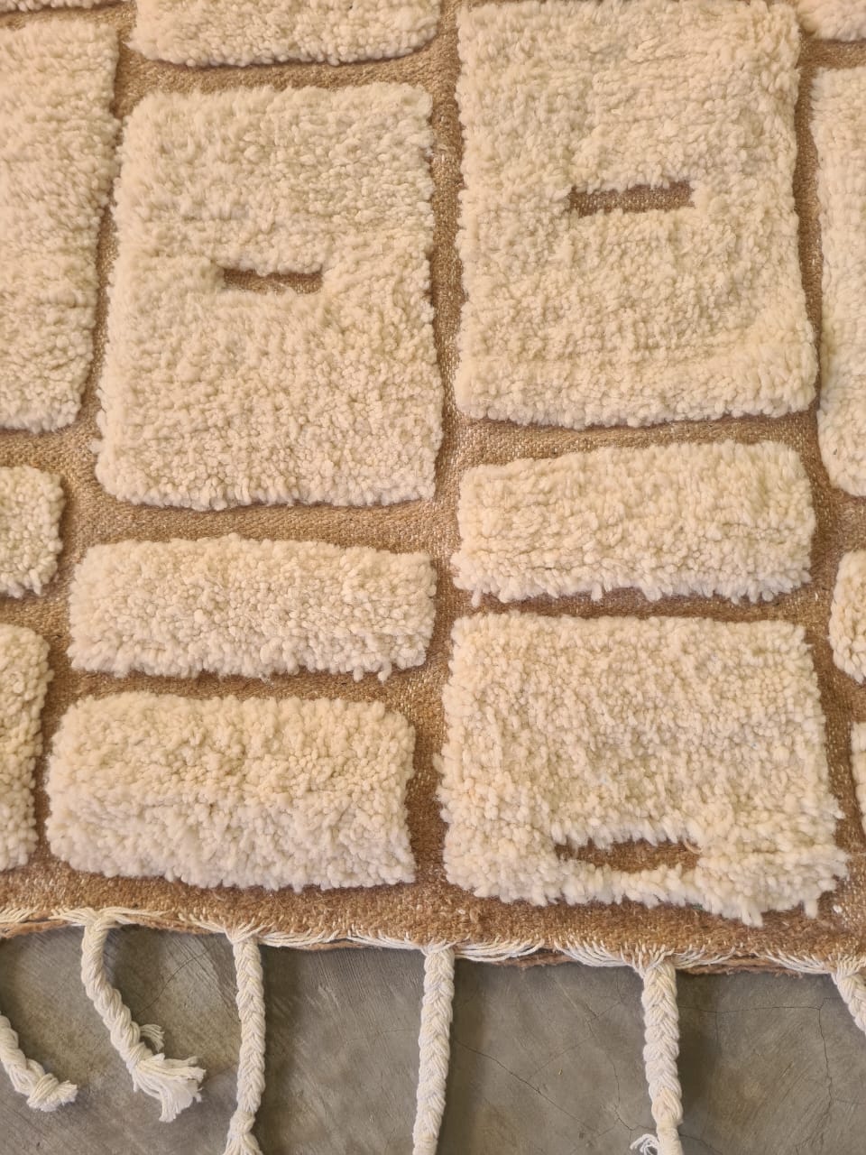 This rug is an original sample from our weaving workshop. Every stitch is handcrafted using undyed or plant-dyed wool sourced from the Atlas. The motifs, symbols, and size can all be reimagined to reflect your own vision.