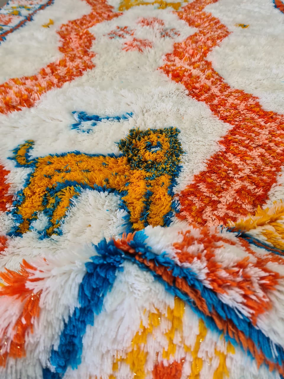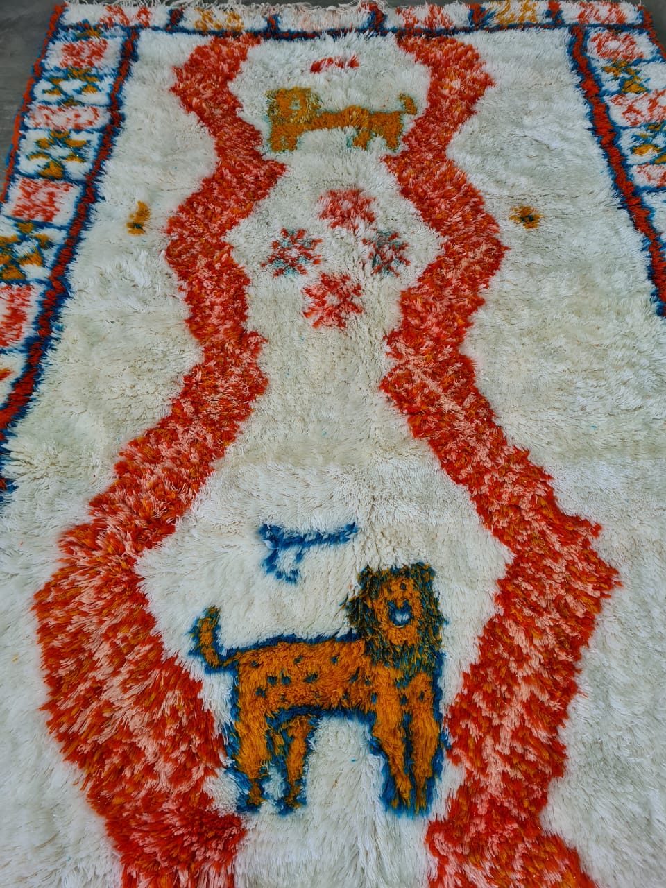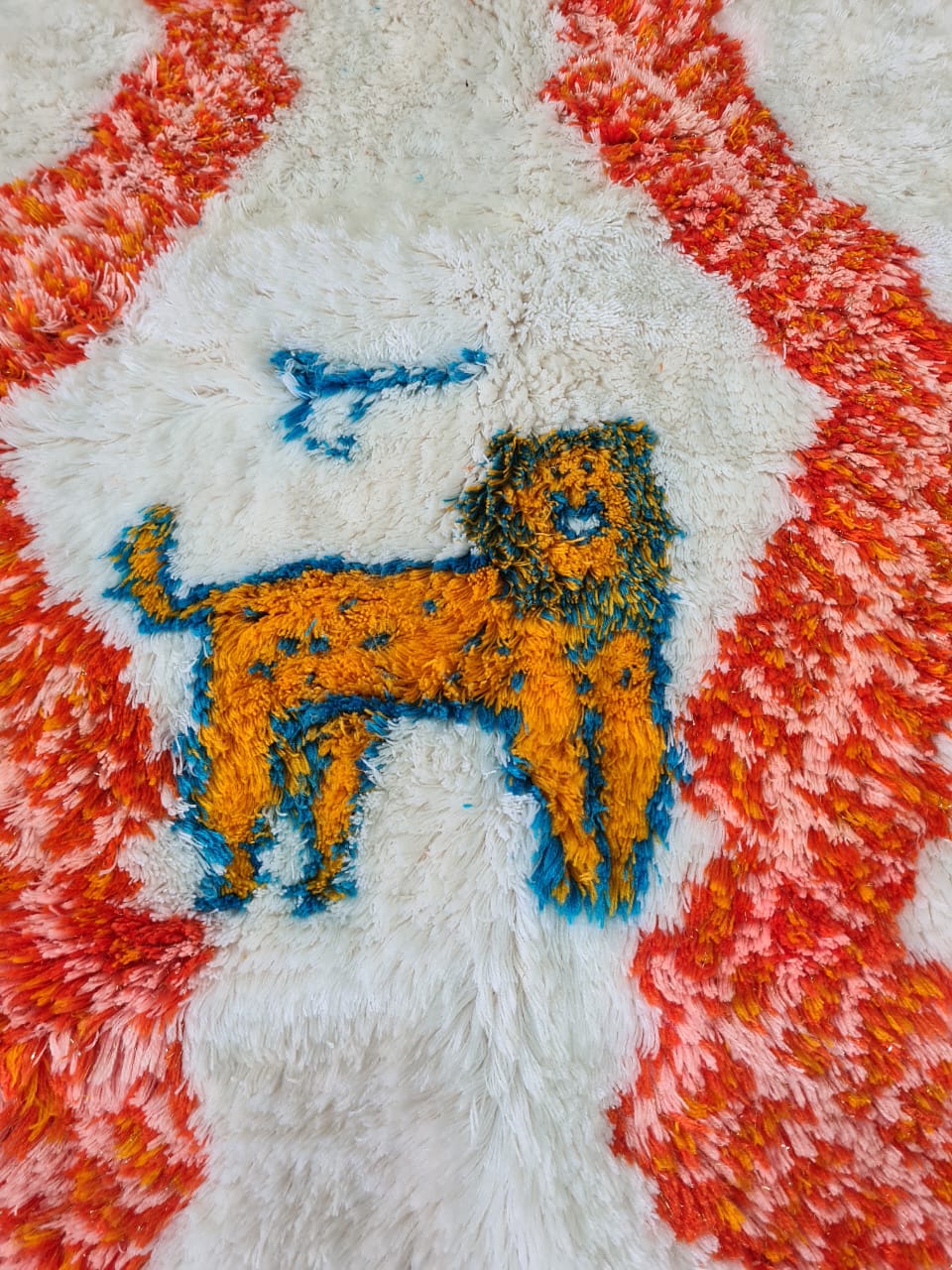 يرمز الأسدان التوأمان إلى القوة واليقظة، بينما يرمز الخط المتعرج - وهو مسار أفعى تقليدي - إلى الحماية وقوة الحياة. تعكس الحواف الزهرية رغبةً في الوفرة والجمال في المنزل. تُستخدم هذه السجادة تقليديًا في المناسبات أو أماكن استقبال الضيوف، وهي قطعة أثرية أصيلة من سرد القصص البربرية باستخدام النول.