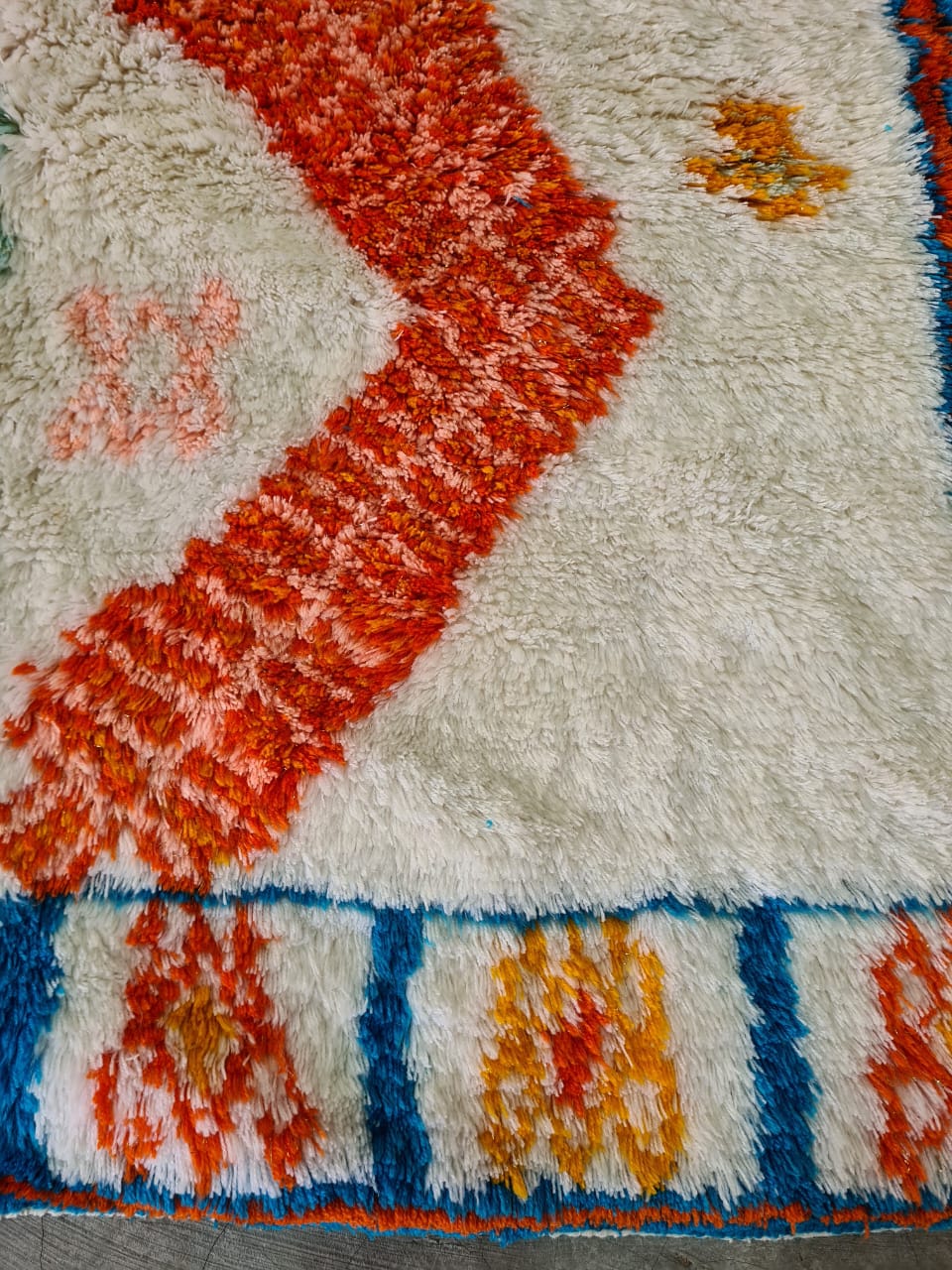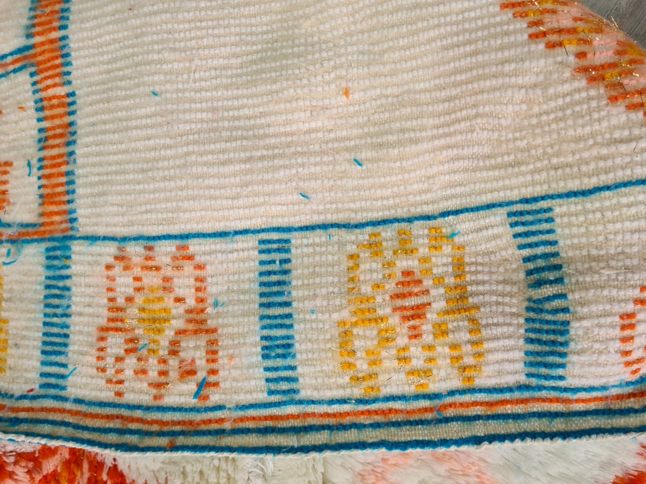 حراس الزيان يجسدون الروح اللونية للأطلس المتوسط ببهجة فولكلورية. هذه القطعة العتيقة من آيت زيان، المنسوجة من صوف الأكريليك الناعم، تنبض برمزية قبلية: أسود وطيور وأزهار وخطوط حراسة متعرجة تسير عبر حقل من الصوف الأبيض الكريمي، محاطة بإطار متألق من رموز برتقالية وزرقاء وذهبية.