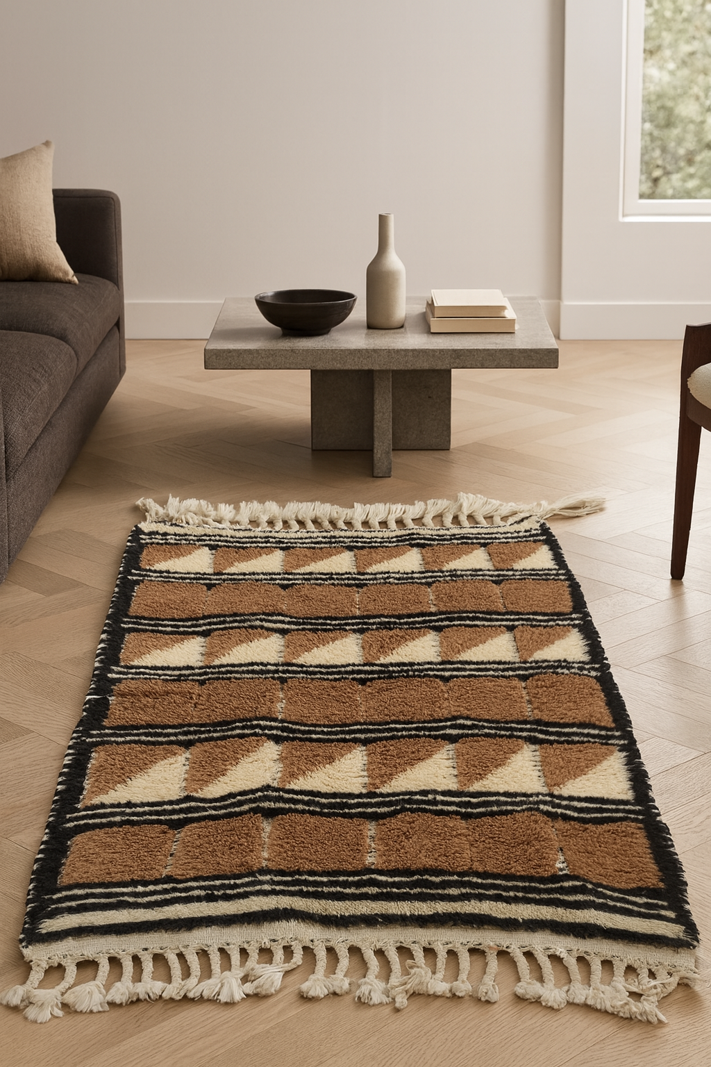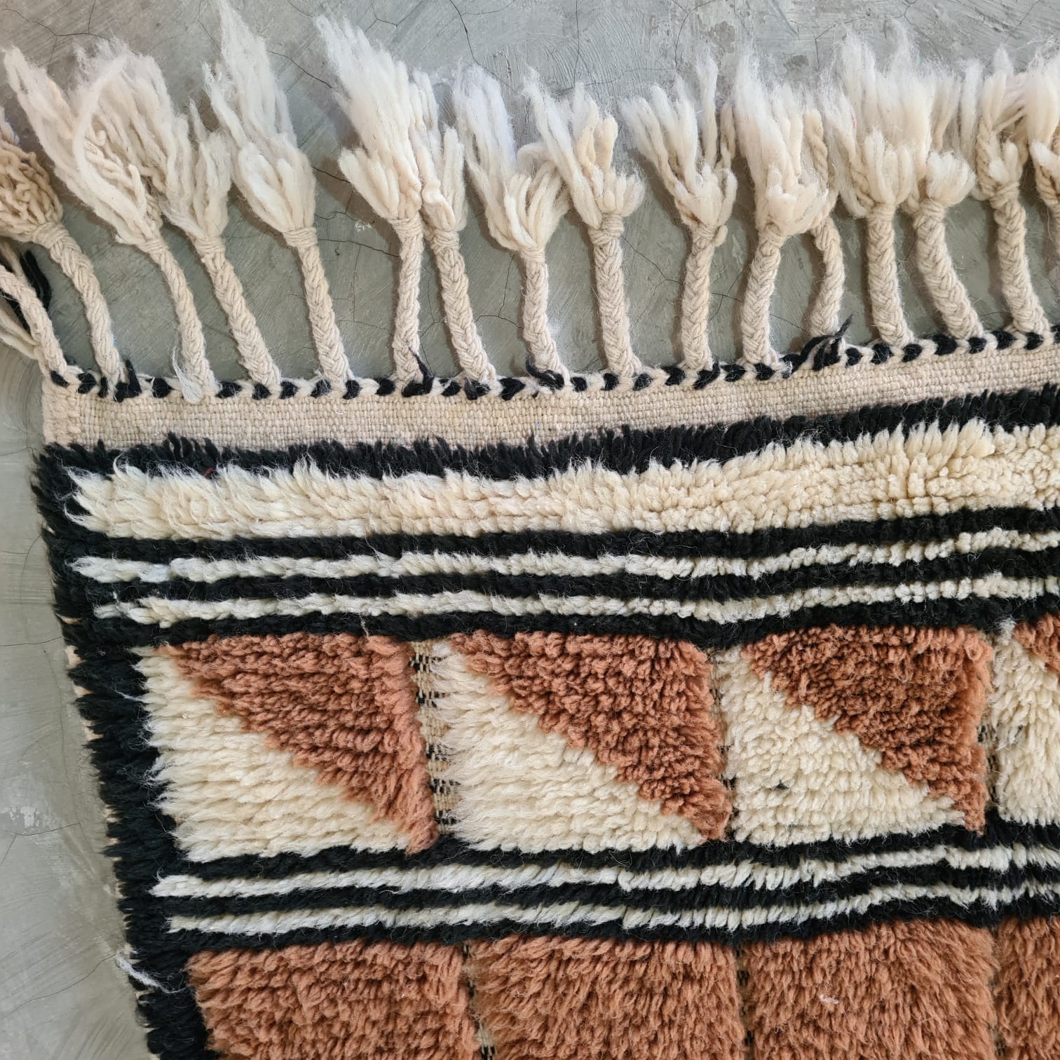 From the Middle Atlas Marmoucha workshops: a graphic register of camel-toned squares split by ivory “fang” triangles and framed by inky guard stripes. The motif reads as a minimalist riff on Amazigh checker iconography—order, rhythm, and calm intensity.