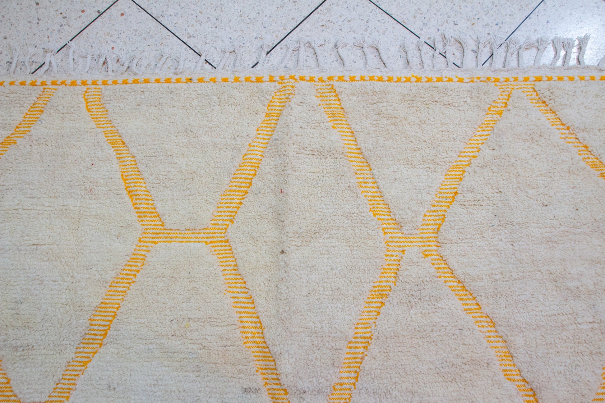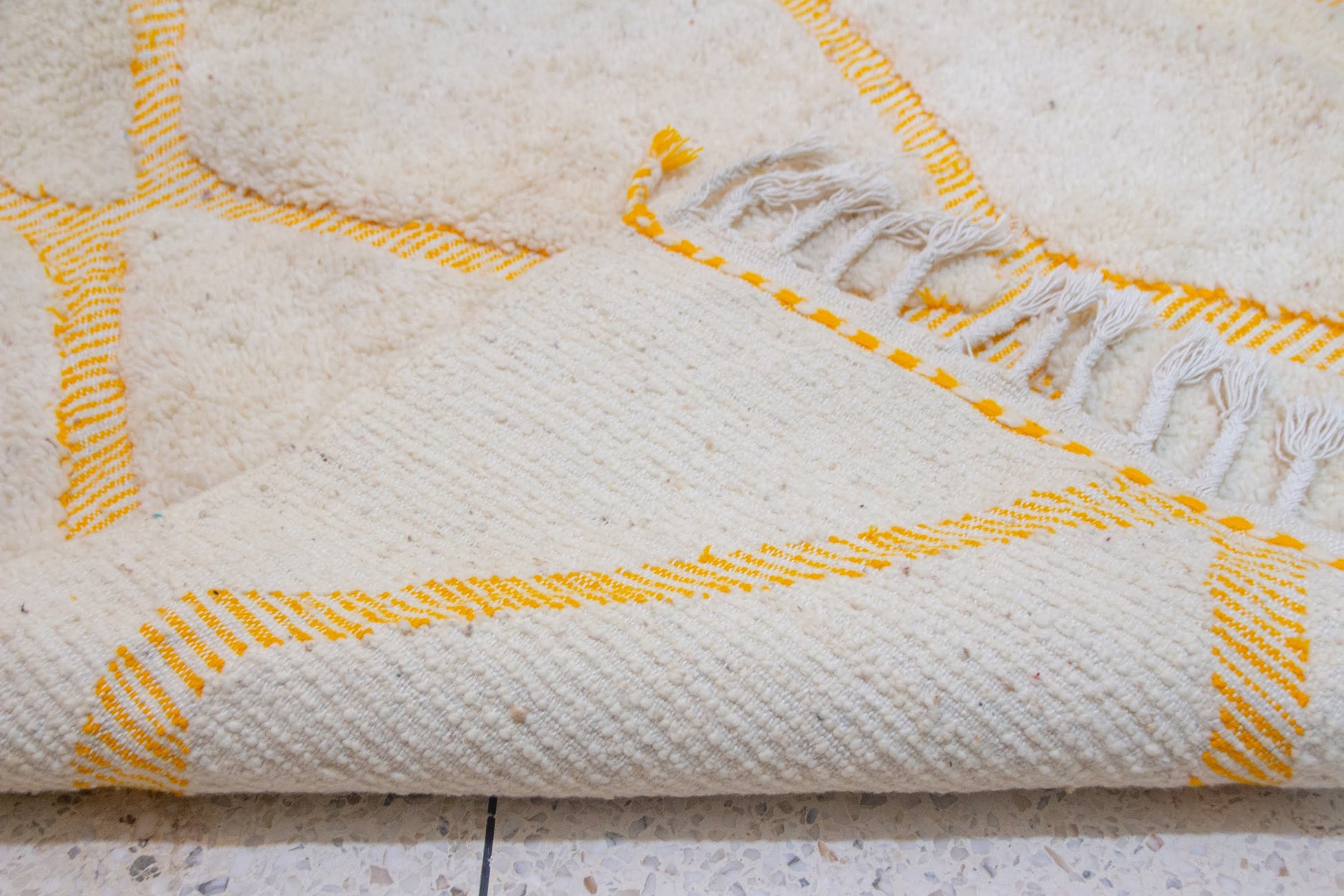 مربع مرموشة هادئ مصنوع من صوف العاج الطبيعي، مفصل بواسطة شبكة مستطيلة الشكل مرسومة بلون الزعفران الدافئ. لمسات خياطة دقيقة على طول أطراف الإطار. الميدان، معبراً عن لغة التوازن والحراسة والتناظر المفتوح في الأمازيغية.