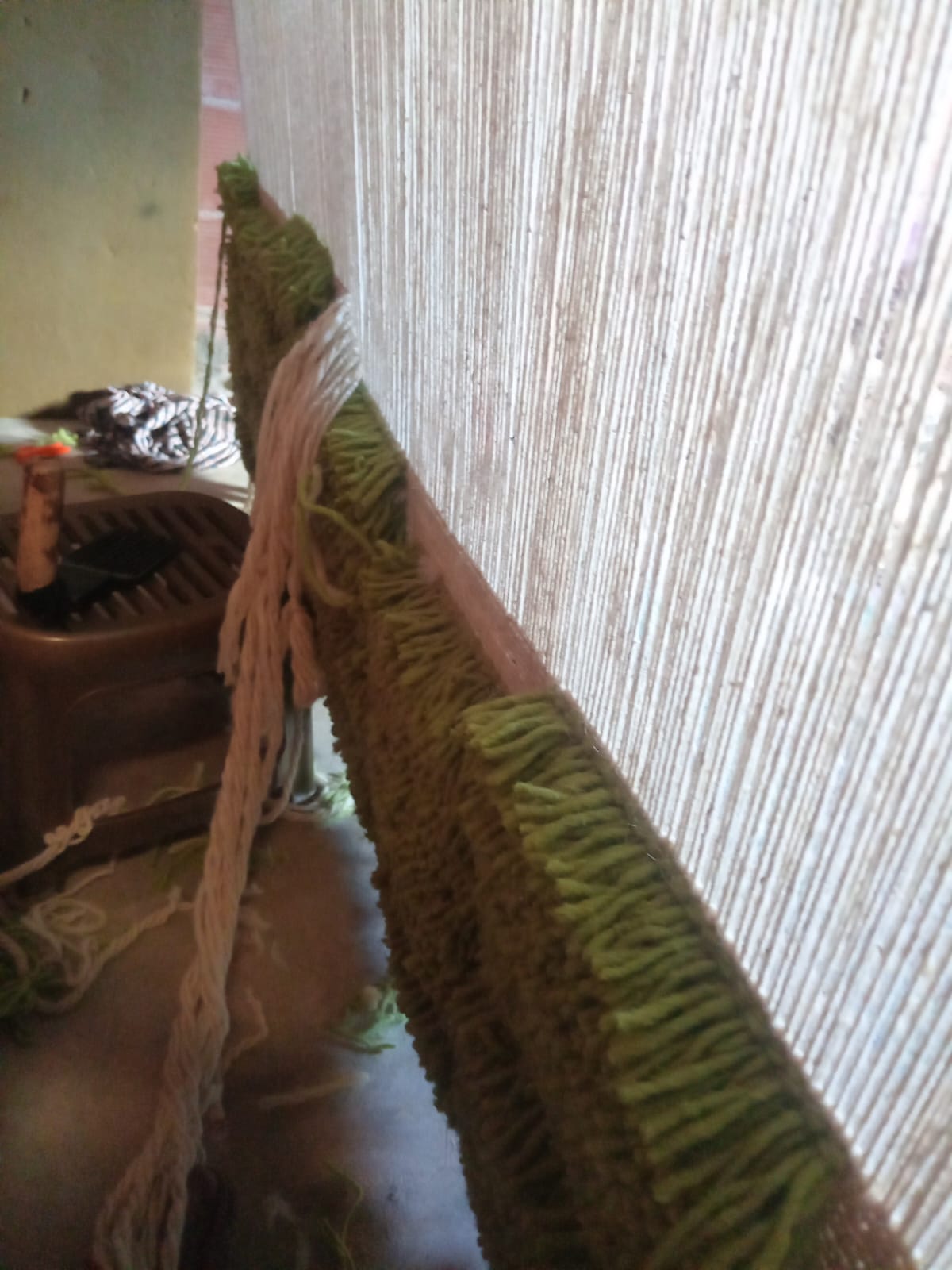 • Materials: Wool (dyed green field with undyed ivory grid)