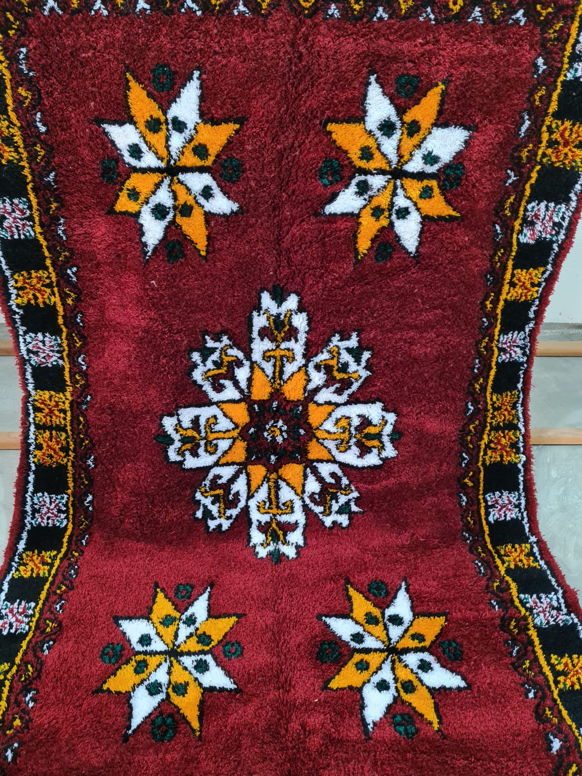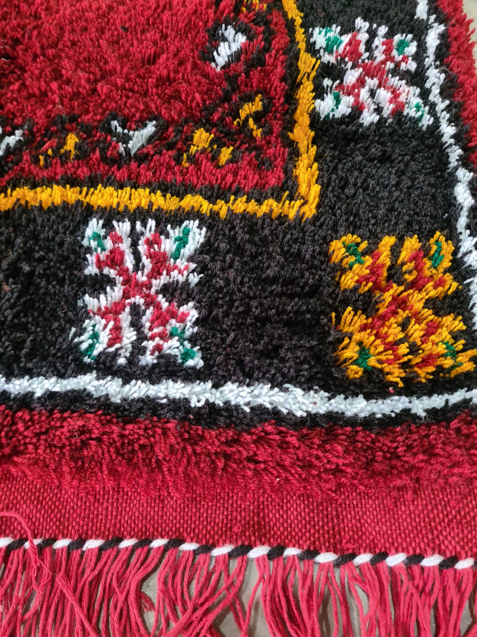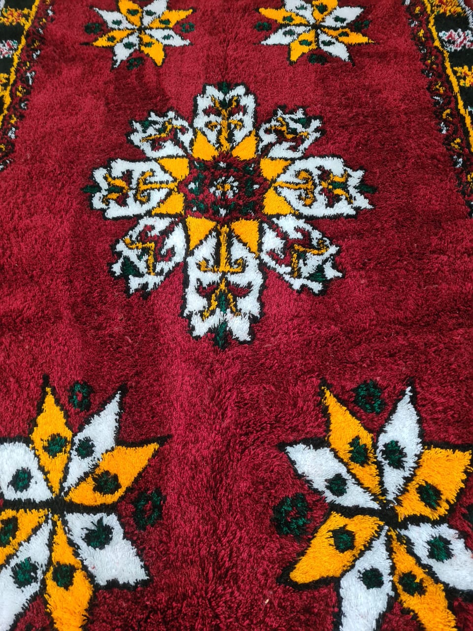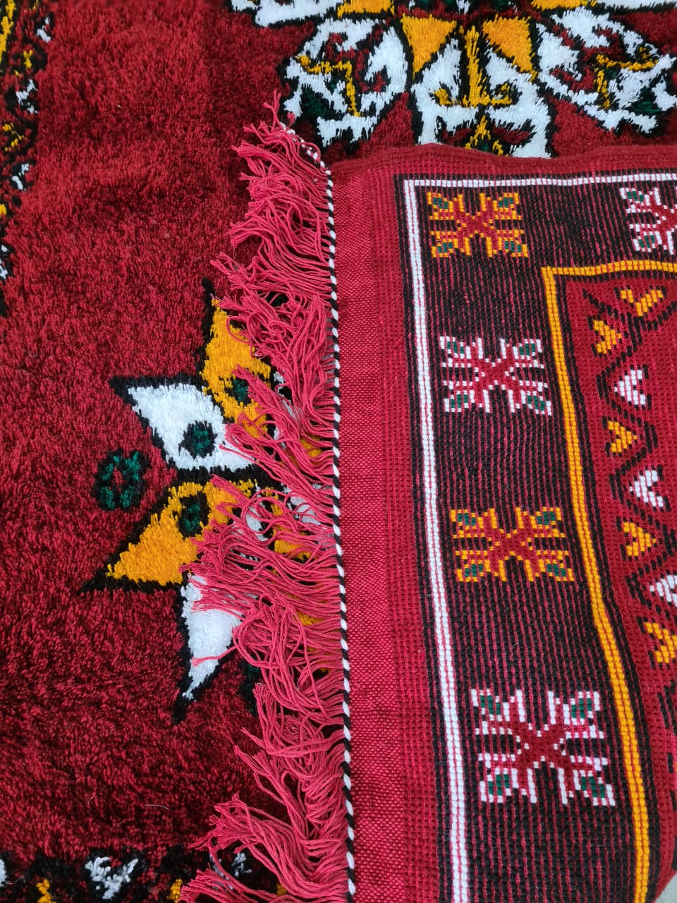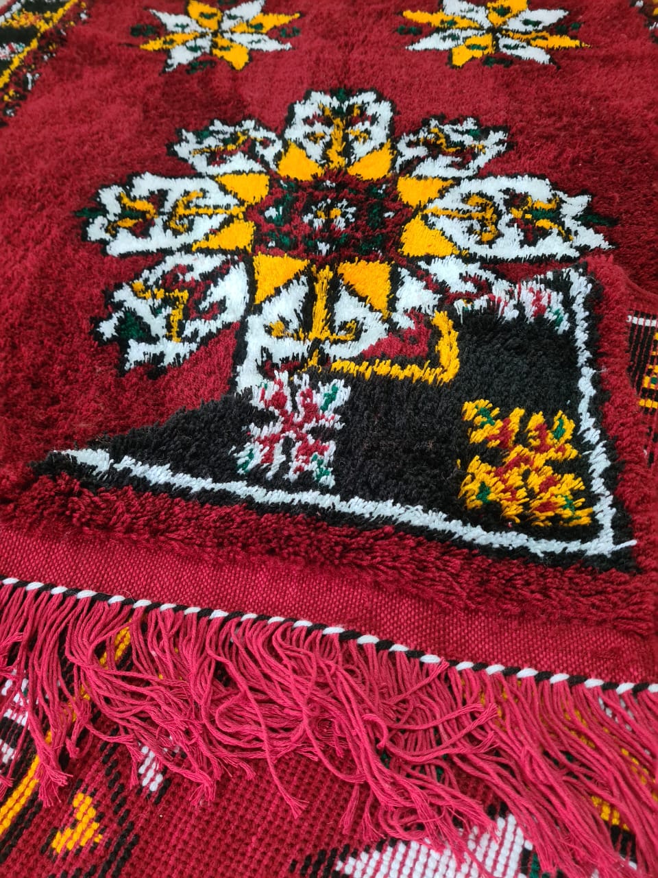 سجادة "كريمسون بلوم" المُشرقة، المُستوحاة من فنون آيت زيان، تُجسّد إعادة تفسير عصرية للزخارف الأمازيغية، مصنوعة من صوف أكريليك ناعم ومتين (يُعرف محليًا باسم "كبة "). يزخر حقلها الأحمر الكرزي الغني بزخارف رمزية مُزهرة تُعبّر عن الوفرة والخصوبة وبركة المنزل.