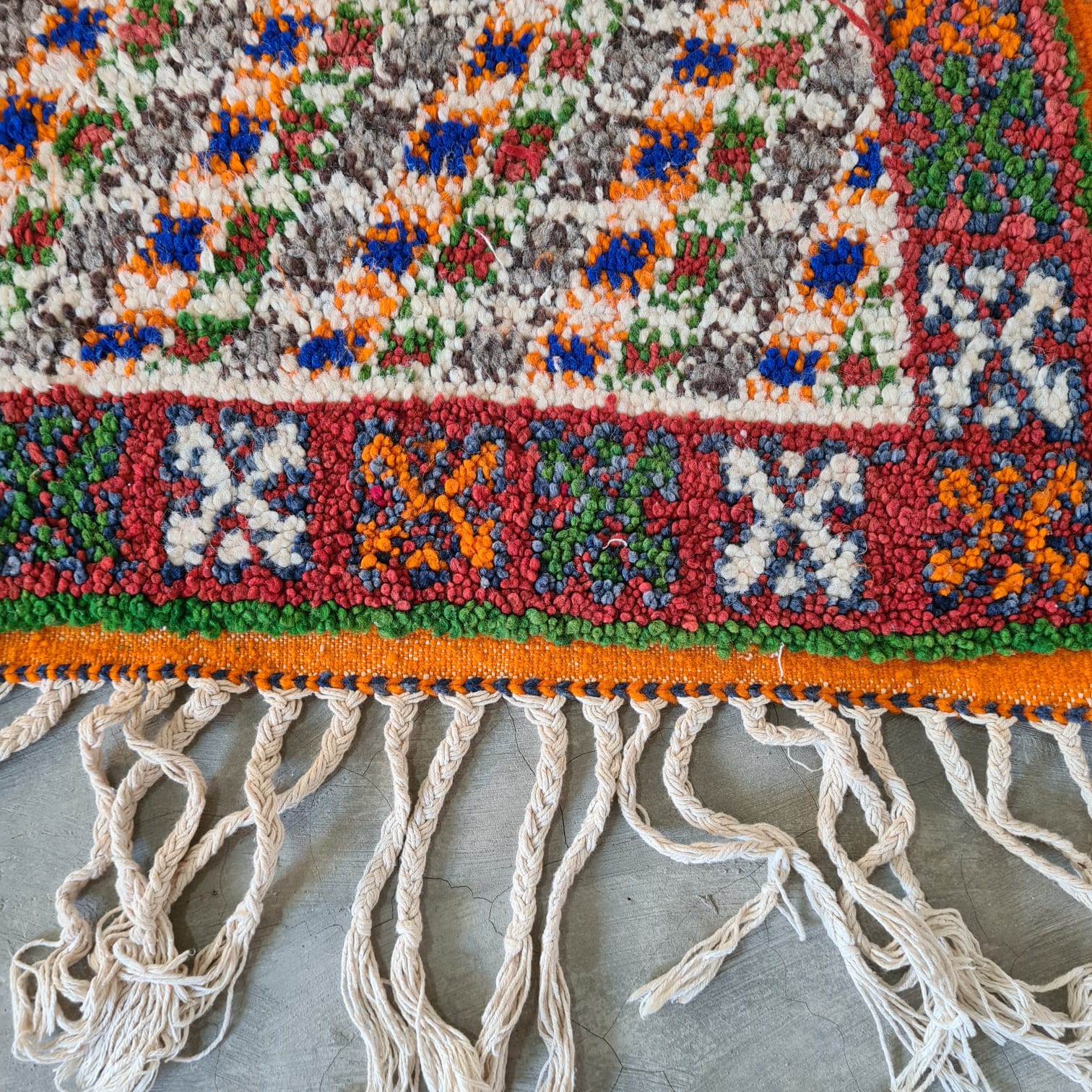 سجادة من وبر تازناخت من أطلس كبير، تتوسطها معينات مسننة كبيرة على أرضية حمراء اللون حقل. تتوهج ميدالية متدرجة متداخلة باللون العاجي والكوبالت، بينما تمتلئ الزوايا الأربع مع ماس شبكي وورود متقاطعة - عرض موسوعي للعلامة واللون الأمازيغي. تعطي الحدود ذات اللون البرتقالي الزعفراني مع أزهار الحراسة إطارًا احتفاليًا للتكوين.