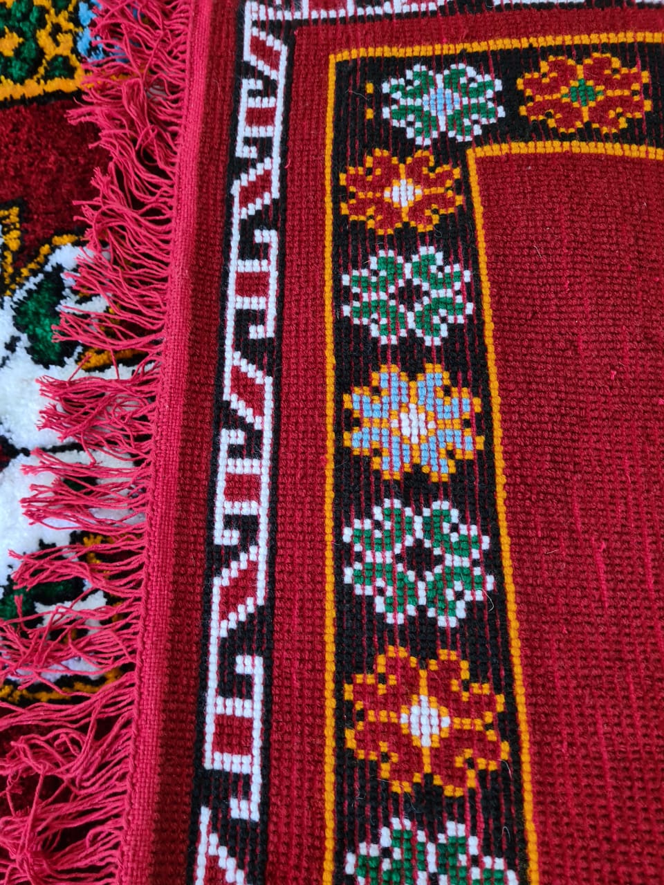 صُممت هذه القطعة لإضفاء الحيوية على أي مساحة بألوانها الدافئة ورموزها المقدسة، وهي قطعة زخرفية ورمزية في آن واحد - نسيجٌ ثقافيٌّ مُجسّد بألوان متباينة وأشكال متناغمة. صُنعت من صوف أكريليك الكبة خفيف الوزن، ما يجعلها سهلة الاستخدام والتخزين والصيانة، مما يجعلها مثالية للغرف المزدحمة أو الأماكن المميزة.