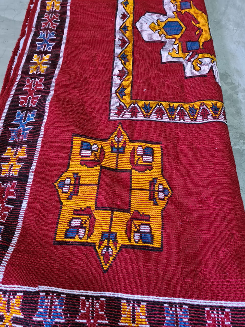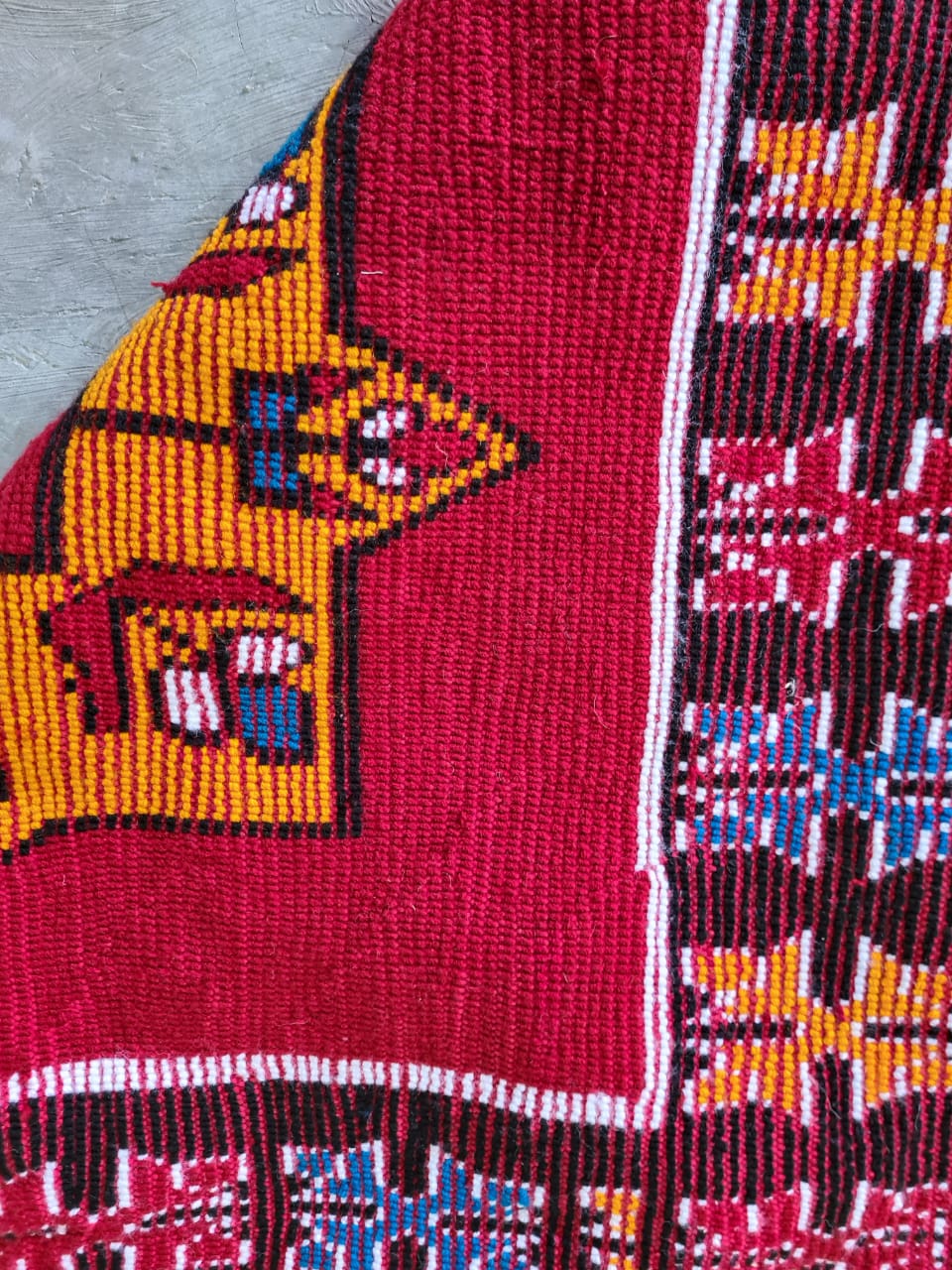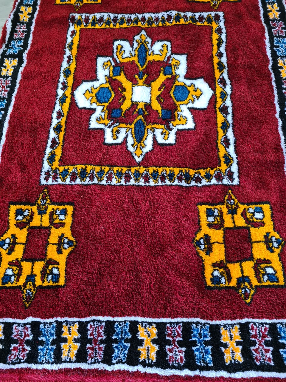 يُجسّد "رياض أحمر" روعة قاعة الاستقبال المغربية التقليدية، مُترجمًا إلى قطعة أثرية عصرية جريئة. منسوج يدويًا في منطقة آيت زين، يستخدم هذا التكوين صوف الكبة الأكريليكي الغني لمحاكاة درجات الأحمر الداكن والذهبي التي غالبًا ما تُرى في منسوجات الصالونات الاحتفالية.