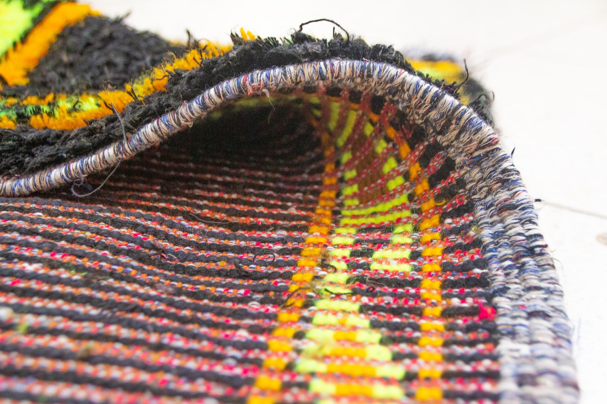 Un tissage kubba audacieux d'Aït Zayane , défini par un champ noir saturé qui encadre des motifs floraux-médaillons rayonnants en or, chartreuse et orange braise. La symétrie verticale des médaillons rappelle les gardiens solaires, tandis que les motifs complexes les bordures ondulent dans des tons verts et jaunes végétaux, enfermant la composition avec vivacité.