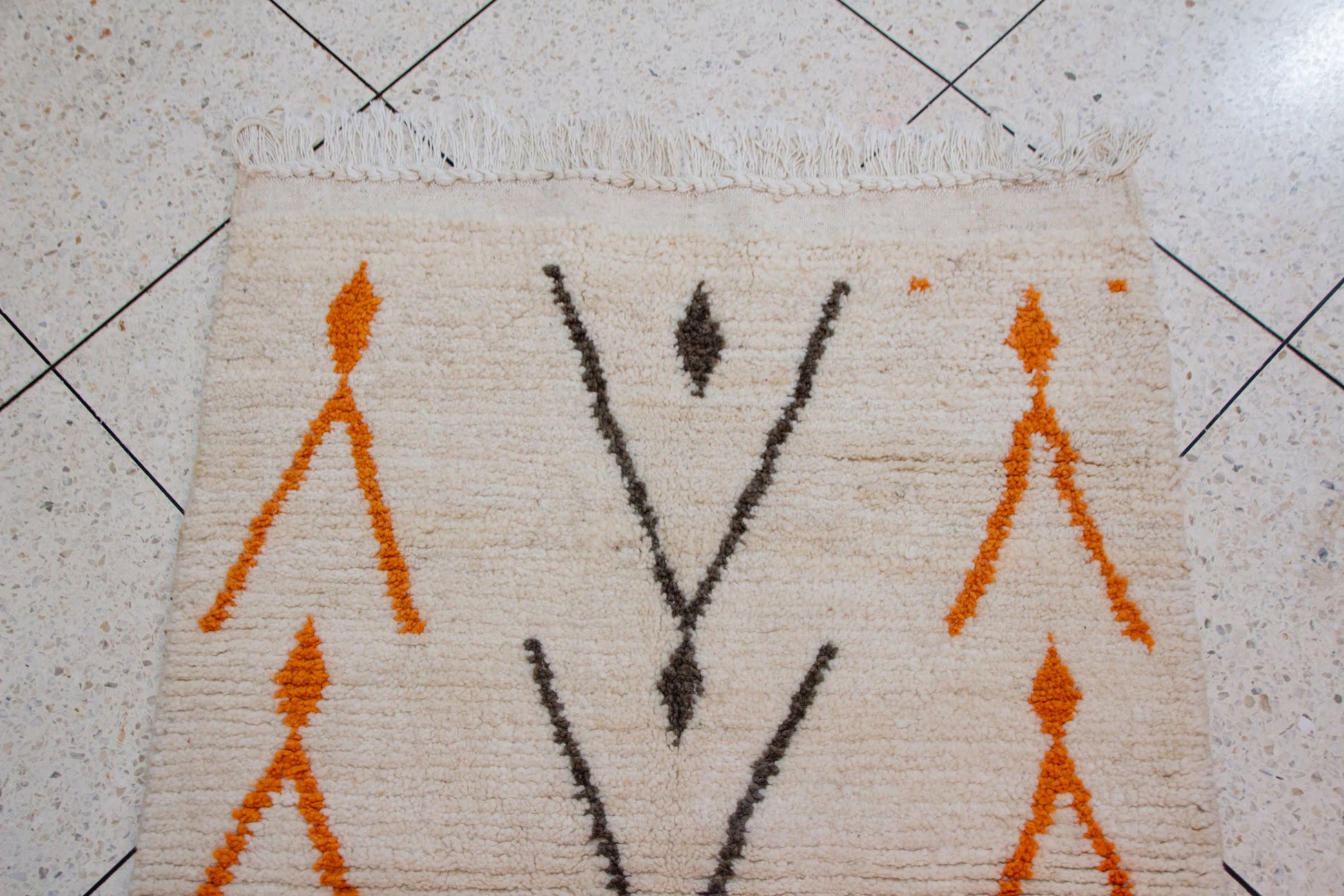 Un tissage compact d'Azilal du Haut Atlas, composé de flèches ascendantes Motifs alternant orange safran et noir anthracite. Tissés sur un fond ivoire, les L'épine centrale des flèches flanquée de chevrons en miroir incarne le symbolisme amazigh de la croissance, vitalité et protection directionnelle.