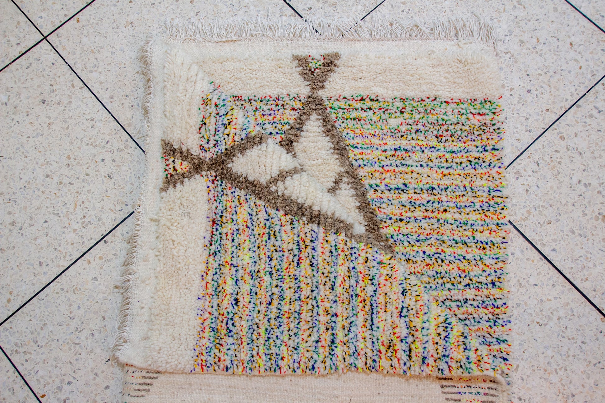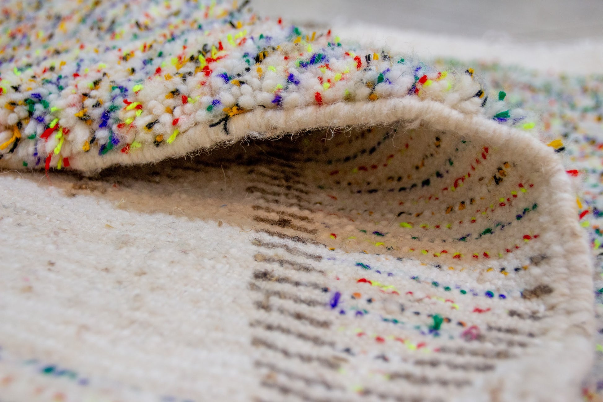 Azilal noué à la main, originaire du Haut Atlas marocain. Un treillis en losanges au charbon de bois dessiné à la main. divise le champ d'ivoire en réserves triangulaires, dont beaucoup sont remplies d'un mélange de confettis vivants de fils colorés. De petits glyphes amazighs (chèques, échelles et signes de branches) ponctuent la composition pour une lecture à la fois graphique et ludique.