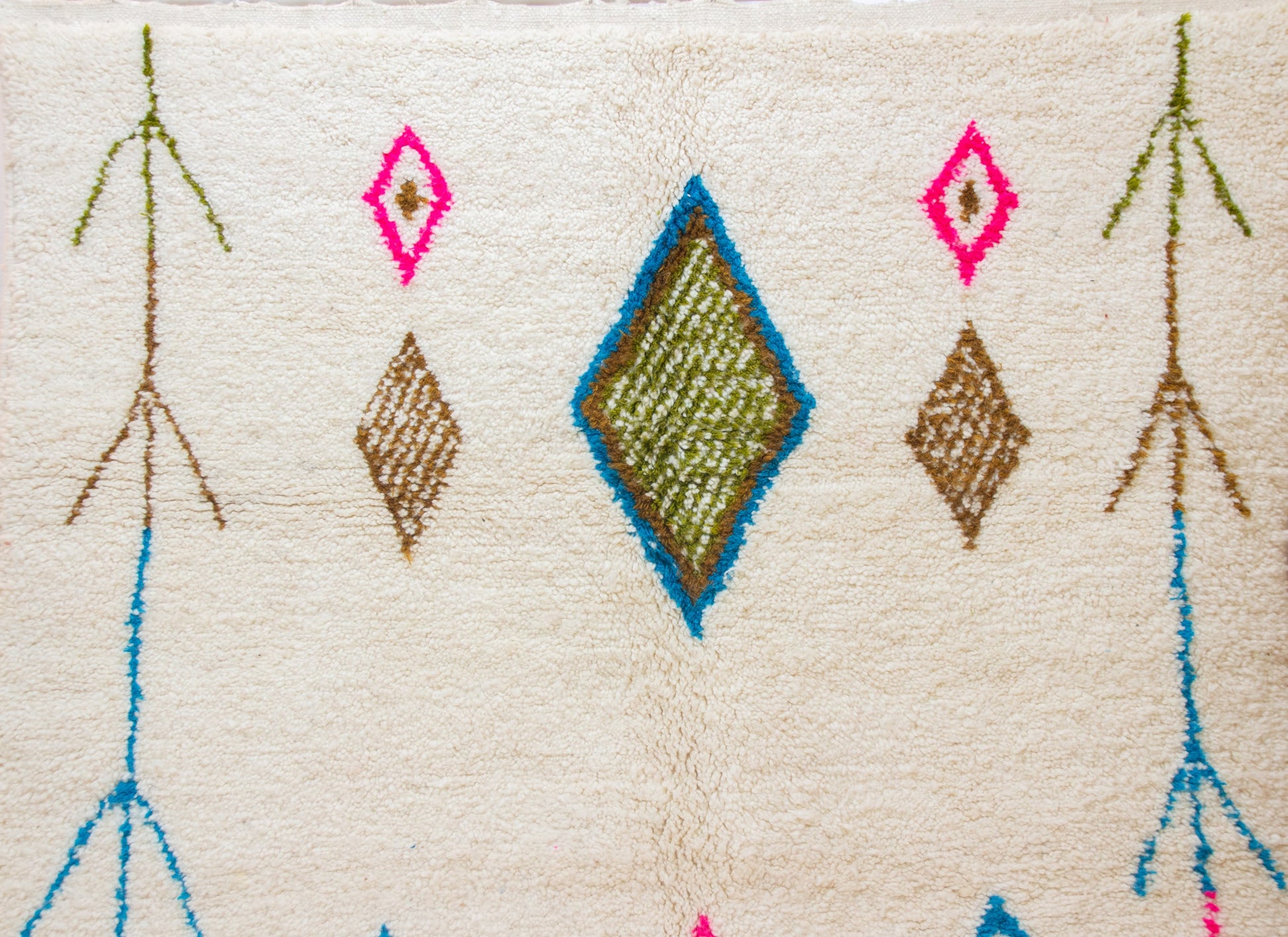 Tapis Azilal — Champ ivoire avec losanges néon et glyphes de branches (250 × 150 cm)