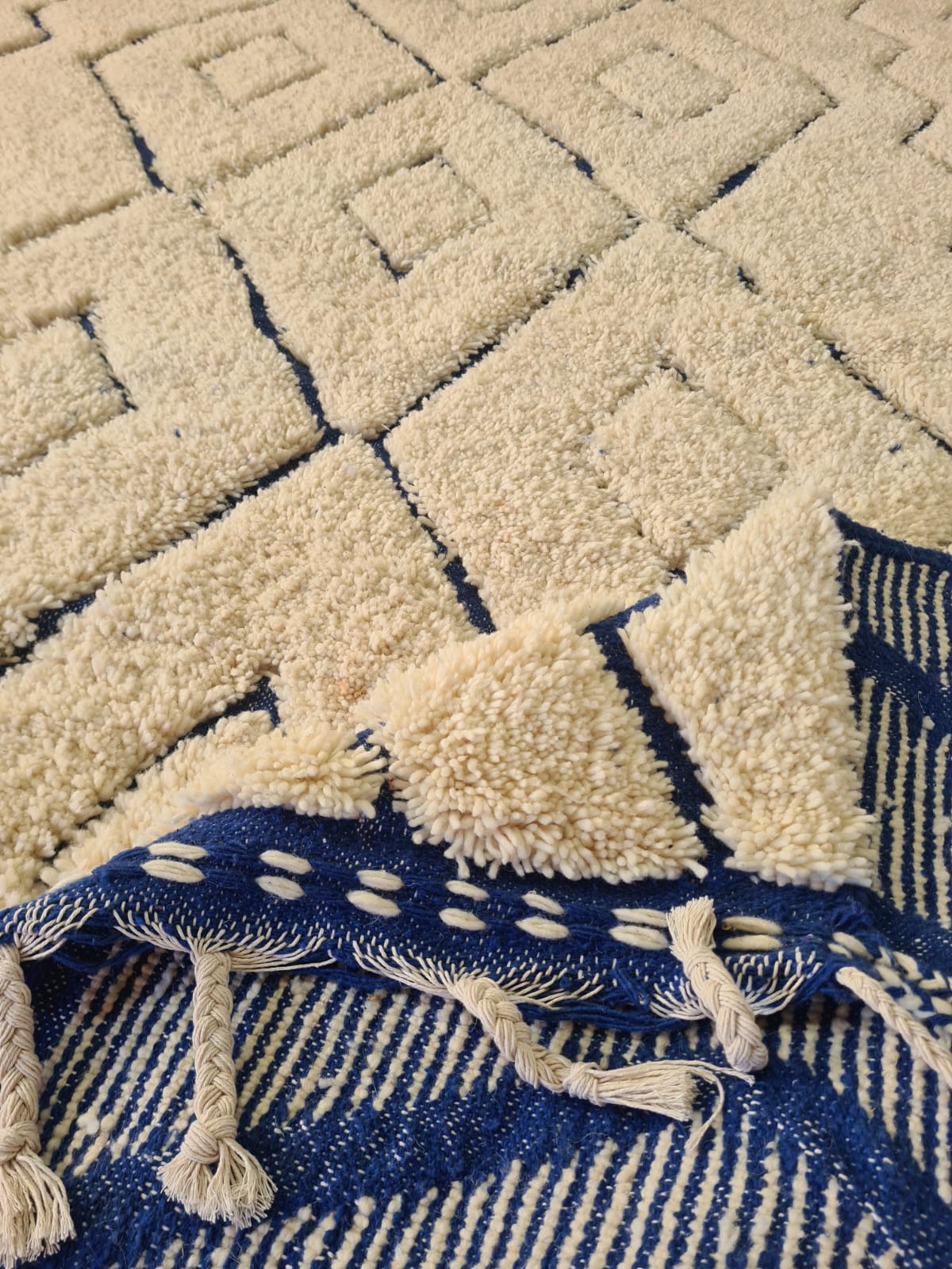 Indigo Grid est un chef-d'œuvre du Moyen Atlas central en laine, tissé selon la tradition Marmoucha. Avec sa laine aux nœuds serrés sur une base luxuriante, ce tapis présente un treillis architectural de losanges abstraits, des formes ancestrales symbolisant la féminité, la continuité et la protection.