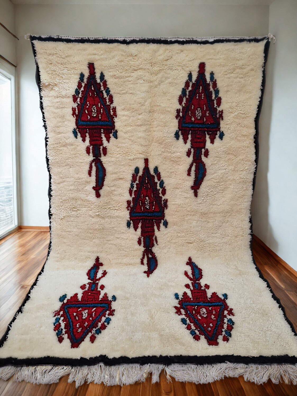 This rug is an original sample from our weaving workshop. Every stitch is handcrafted using undyed or plant-dyed wool sourced from the Atlas. The motifs, symbols, and size can all be reimagined to reflect your own vision.