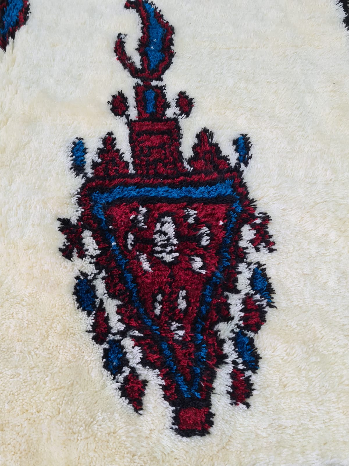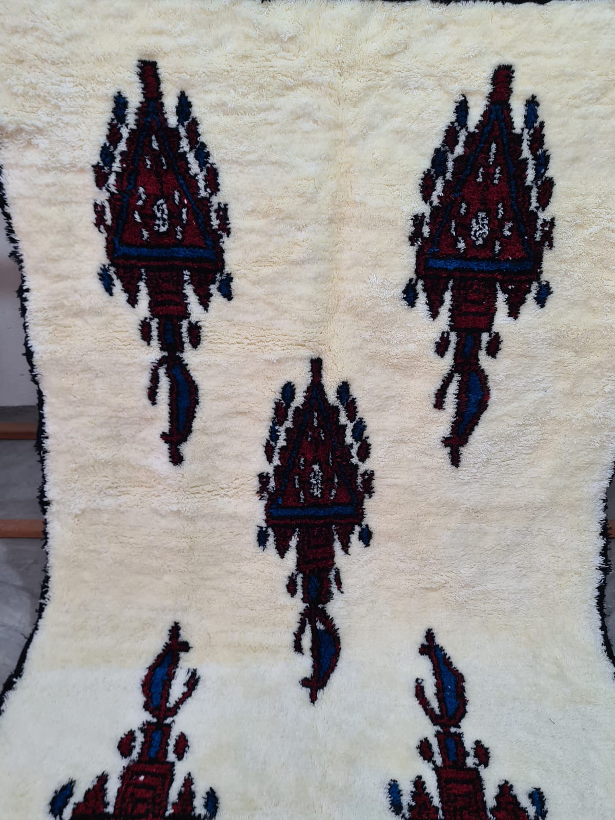 Le tapis présente un champ ivoire minimaliste contrastant avec des glyphes répétitifs, évoquant des totems, dans des tons rouge foncé et violet – un hommage chromatique aux tons de terre et de feu de l'architecture des hauts plateaux marocains. La composition évoque des motifs rituels ancestraux, structurés selon un rythme symétrique moderne.