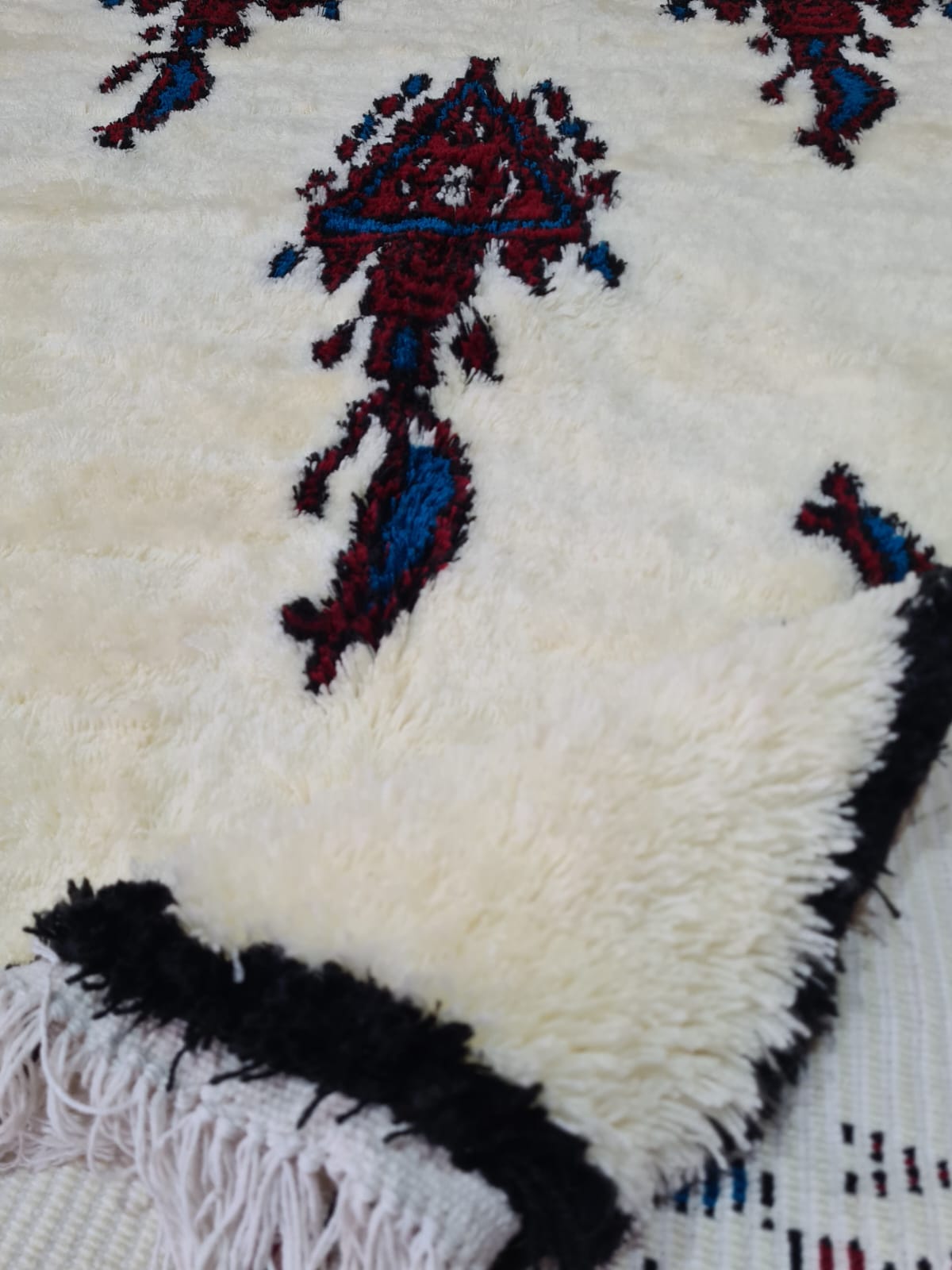 Tissé en kubba (laine acrylique), ce vêtement est léger, résistant et lavable, idéal pour les espaces à fort passage ou pour une superposition dans les intérieurs modernes. Il incarne une forte identité amazighe tout en offrant une praticité. Chaque symbole est porteur d'une valeur culturelle héritée, interprétée de manière unique par l'artisan.