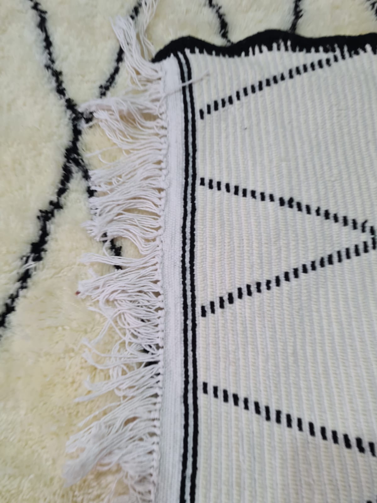 « Symétrie silencieuse » est un tissage plat léger originaire de la région d'Aït Zyayne, réalisé en laine acrylique et présentant un contraste saisissant de noir et d'ivoire. La composition suit un réseau de losanges croisés suspendus entre des lignes rythmiques, créant un équilibre méditatif entre mouvement et immobilité.