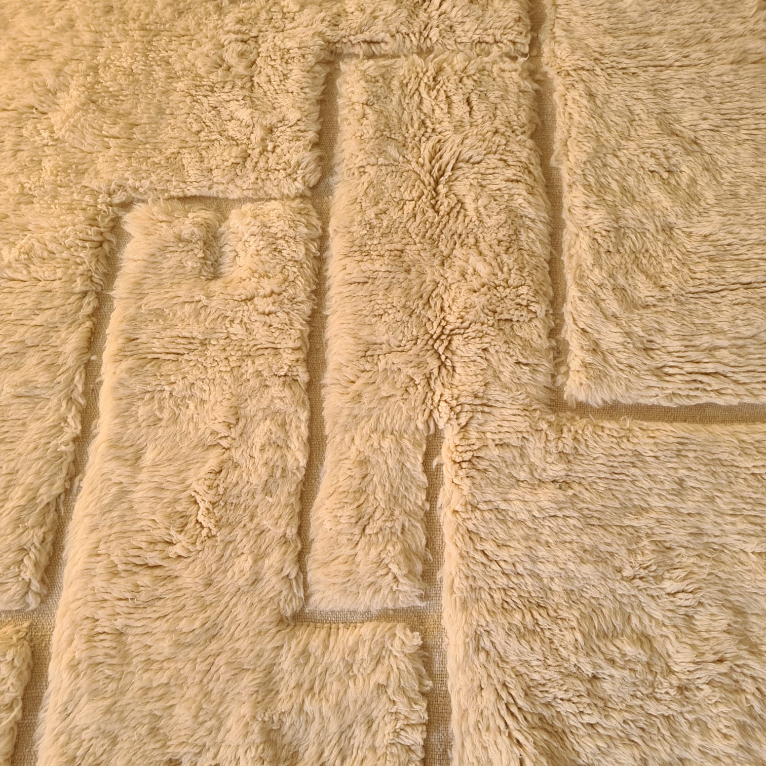 Poil de laine dense noué à la main sur une base solide, puis différencié taillé pour dessiner des lignes en relief (sculpture haute-basse). Le manche est moelleux et velouté grâce à ressort résilient typique des toisons Atlas.