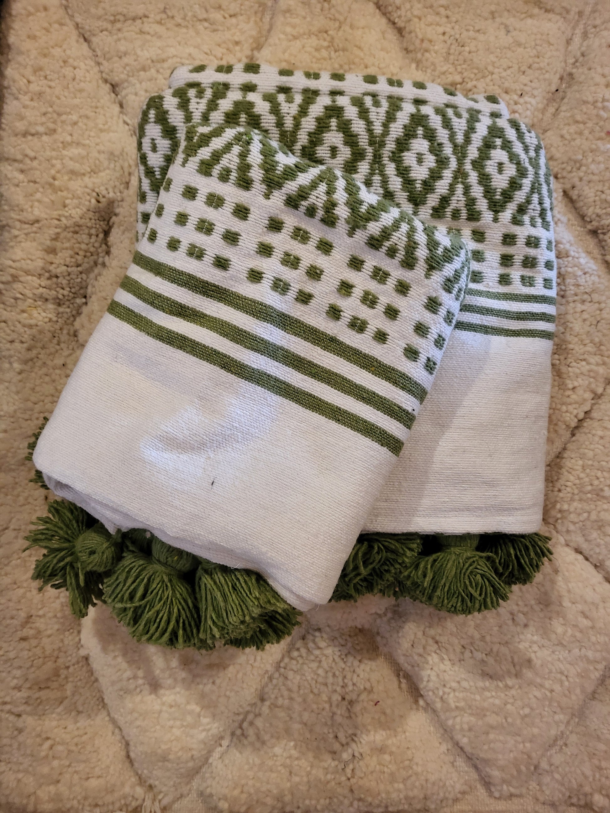 Issu des ateliers atlantiques de Safi , cet ensemble en coton articule l'amazighité bandes avec une clarté disciplinée : registres olive — losanges, damier et bandes de garde — traversent un fond ivoire apaisant. Des coussins assortis reproduisent la bande verticale pour un ensemble cohérent. silhouette éditoriale ; les glands offrent une cadence mesurée et finie à la main.