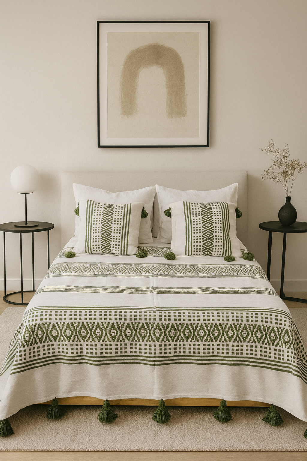Ensemble Safi Loom — Registres olive sur ivoire (couvre-lit 300 × 200 cm + deux oreillers 50 × 50 cm)