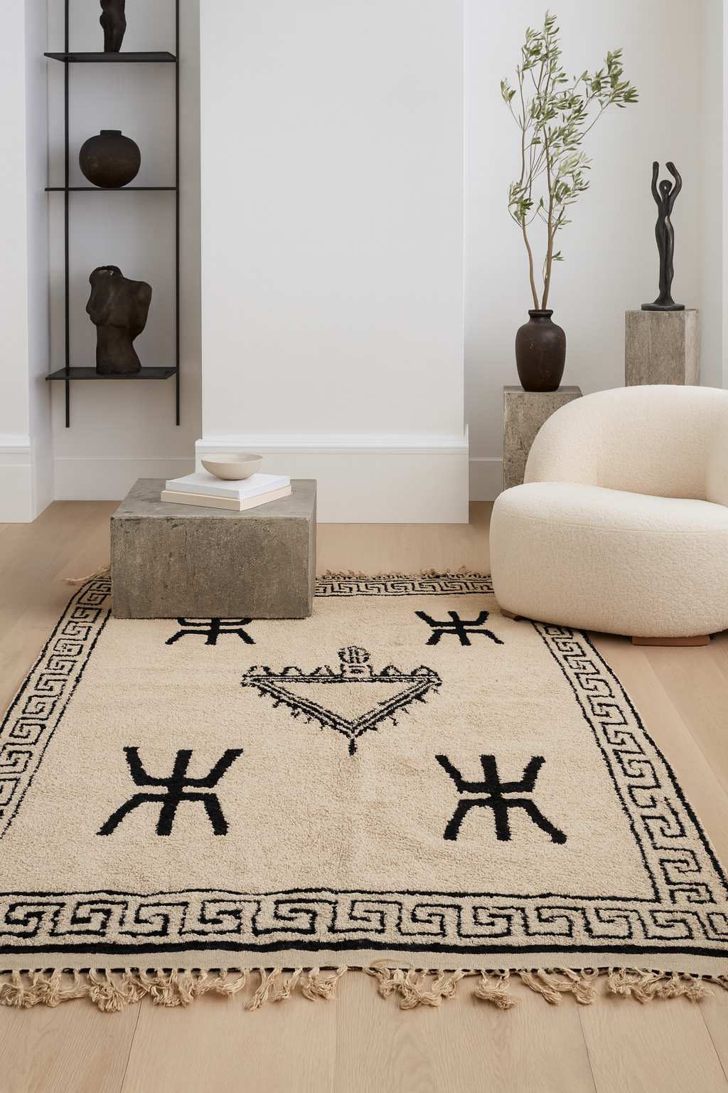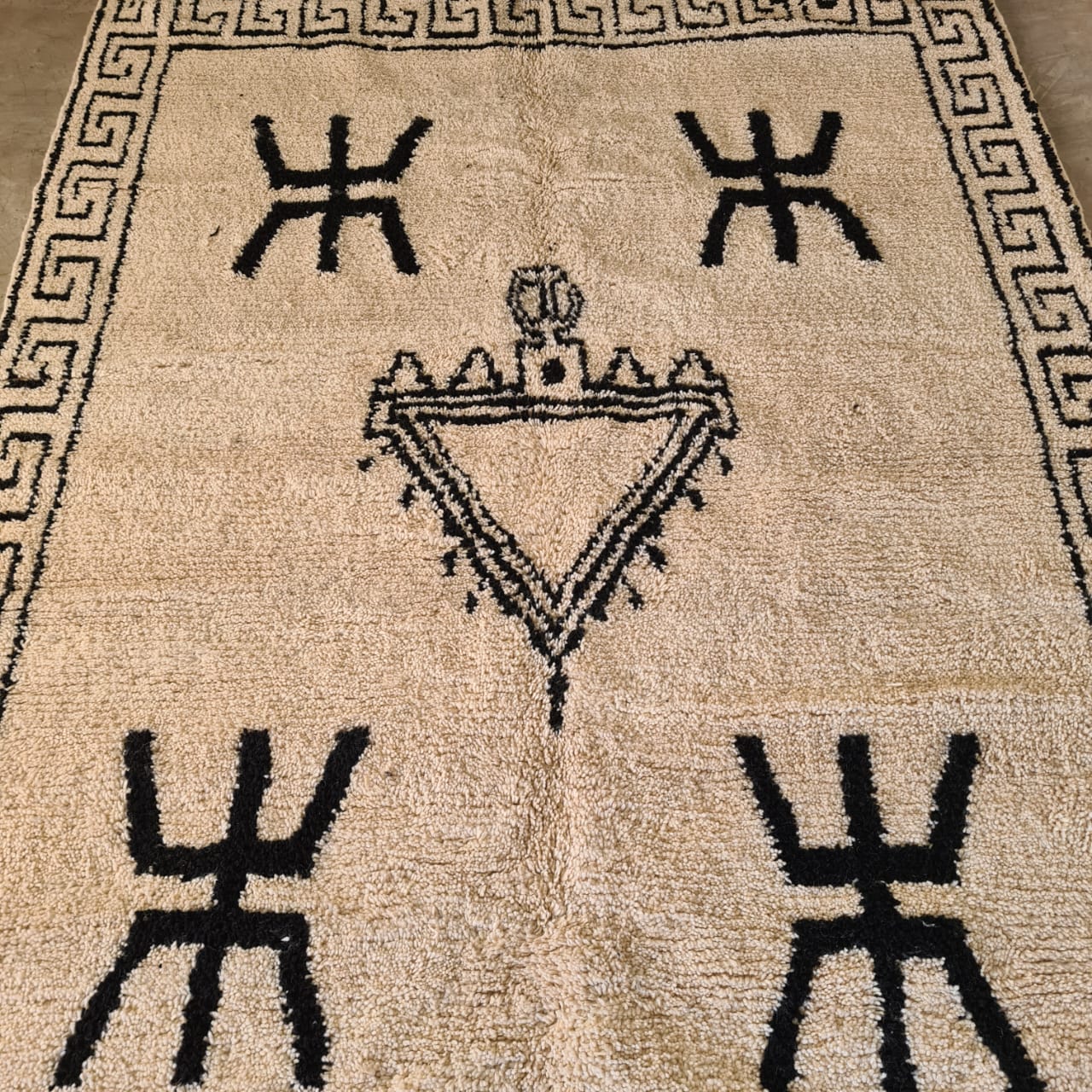 This rug is an original sample from our weaving workshop. Every stitch is handcrafted using undyed or plant-dyed wool sourced from the Atlas. The motifs, symbols, and size can all be reimagined to reflect your own vision.