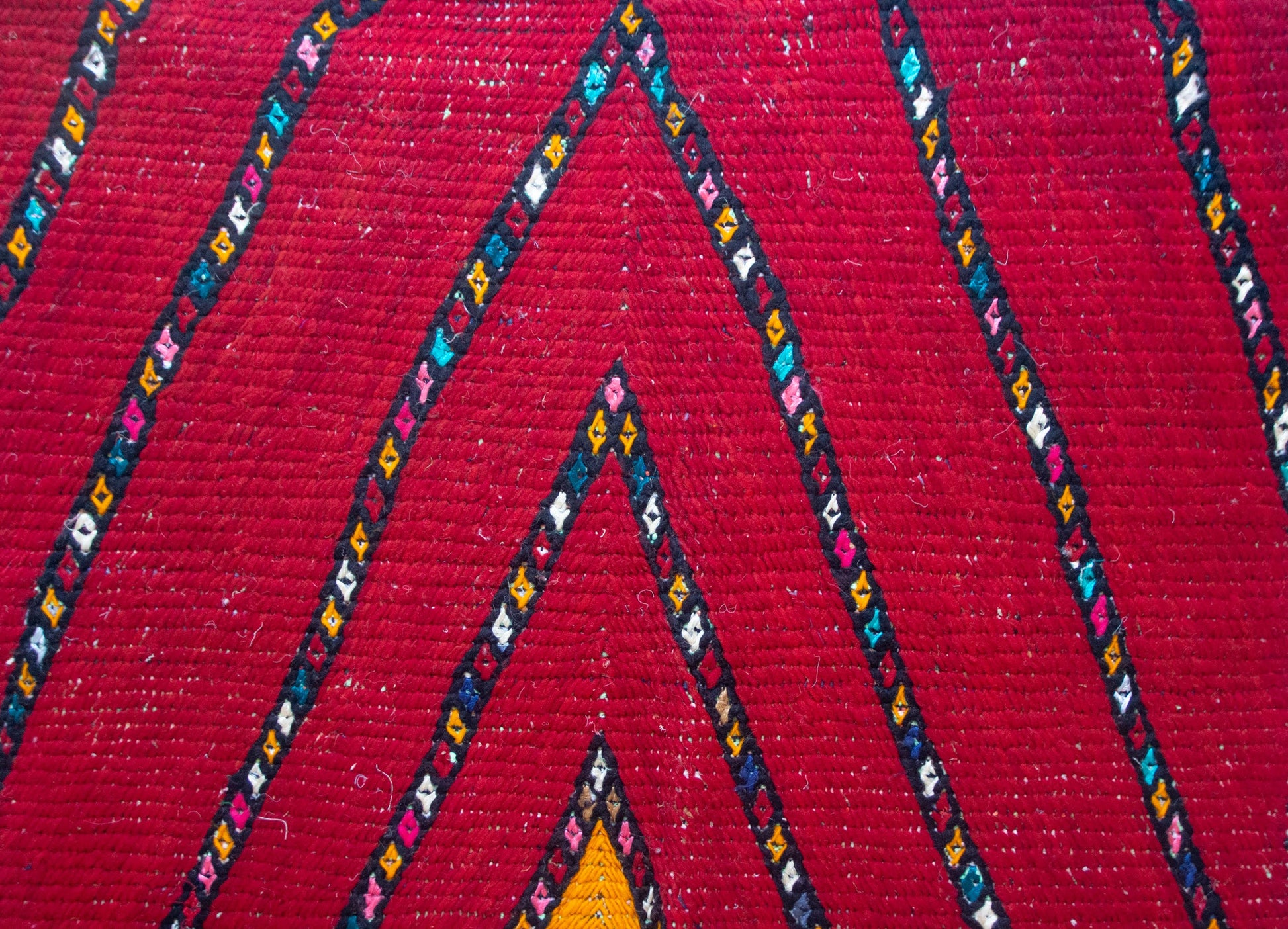 Radiant diamonds on crimson ground—Zayane fire woven into wool and rhythm.