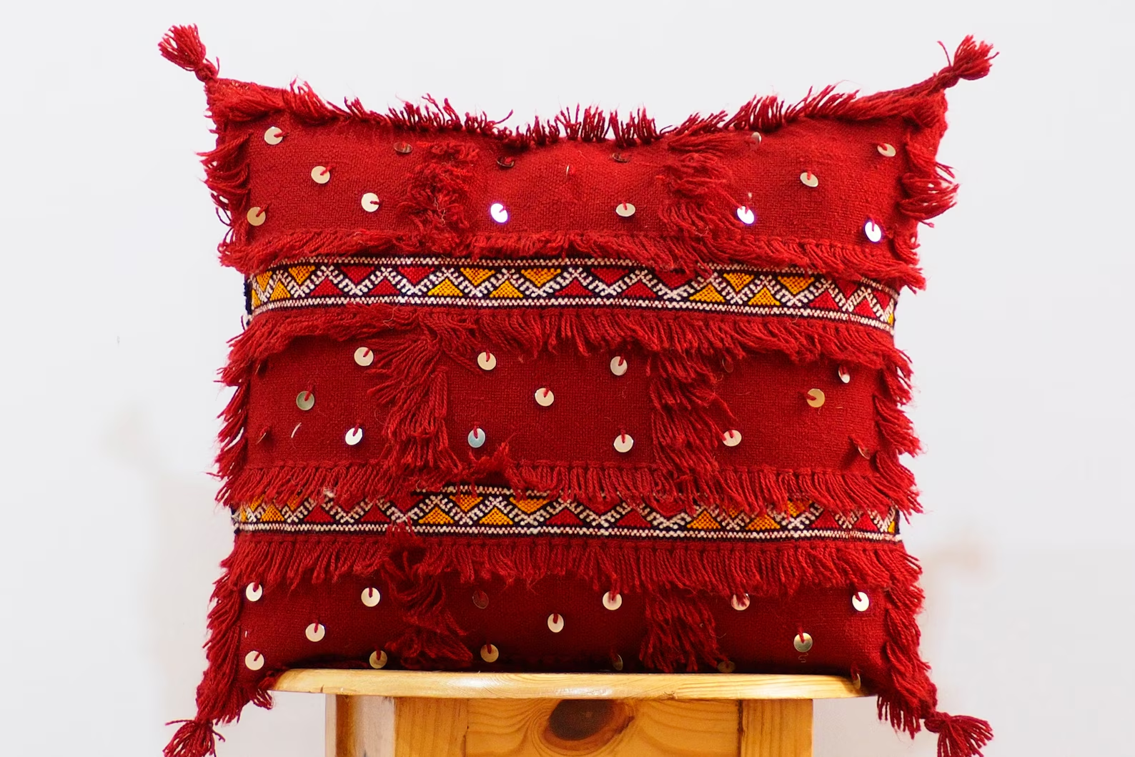Hand-loomed kubba pillows from the Aït Zayane weaving circle: shag-fringed bands and hand-sewn sequins (mouzouna) articulate a protective bridal syntax on a saturated pomegranate-red field. A chevron tislit braid anchors the composition—heritage geometry with contemporary poise.