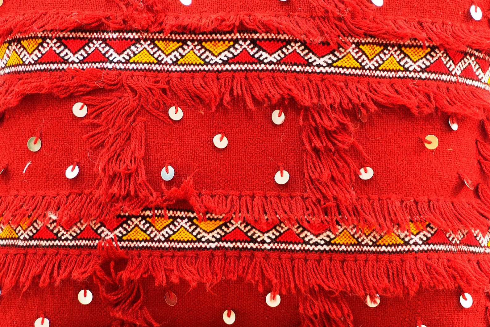 - Construction: Handwoven wool face; cotton lining/back; hand-fringed bands; hand-applied metal sequins