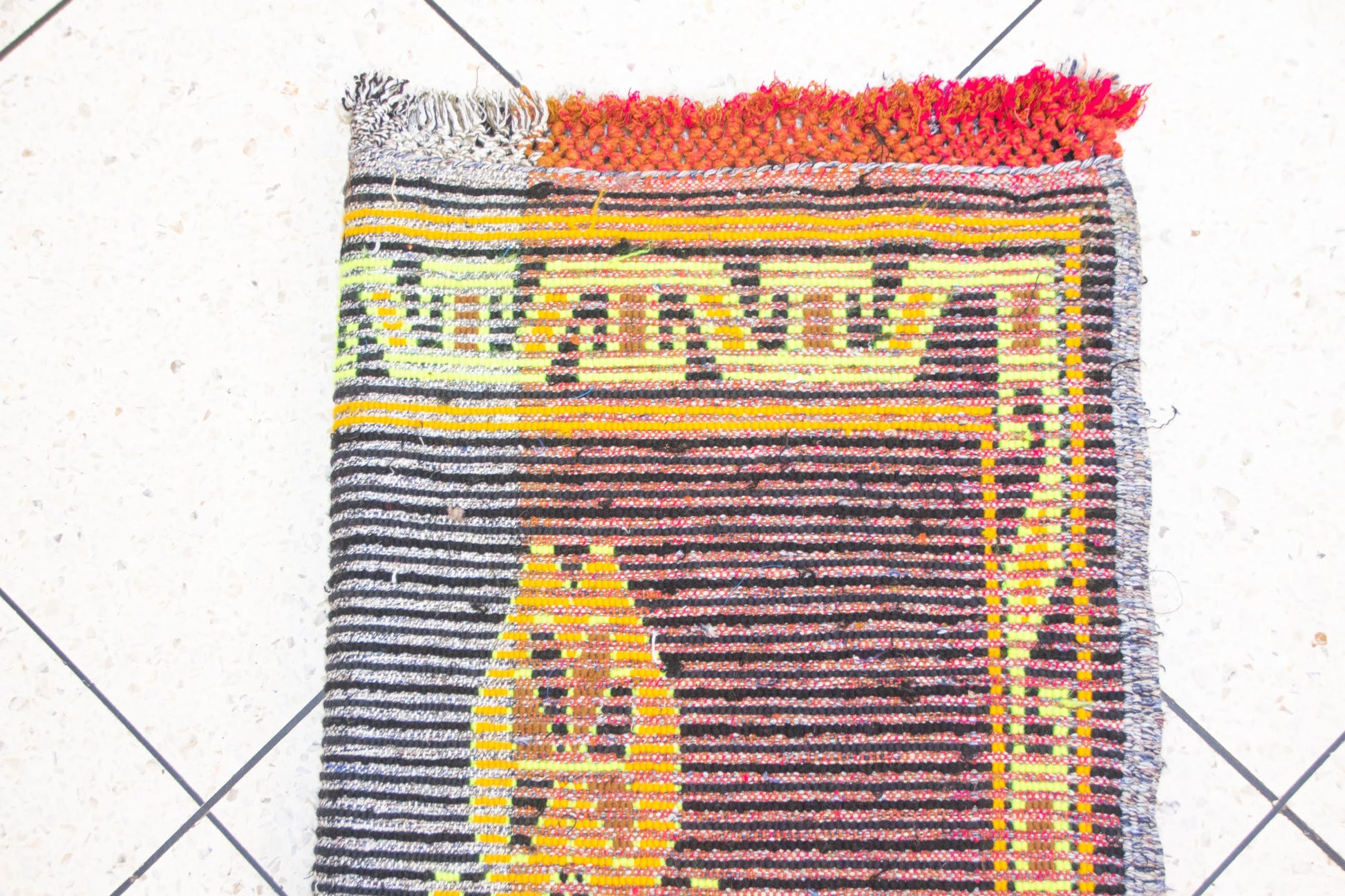 - Fringe: Natural with subtle red and grey end knots