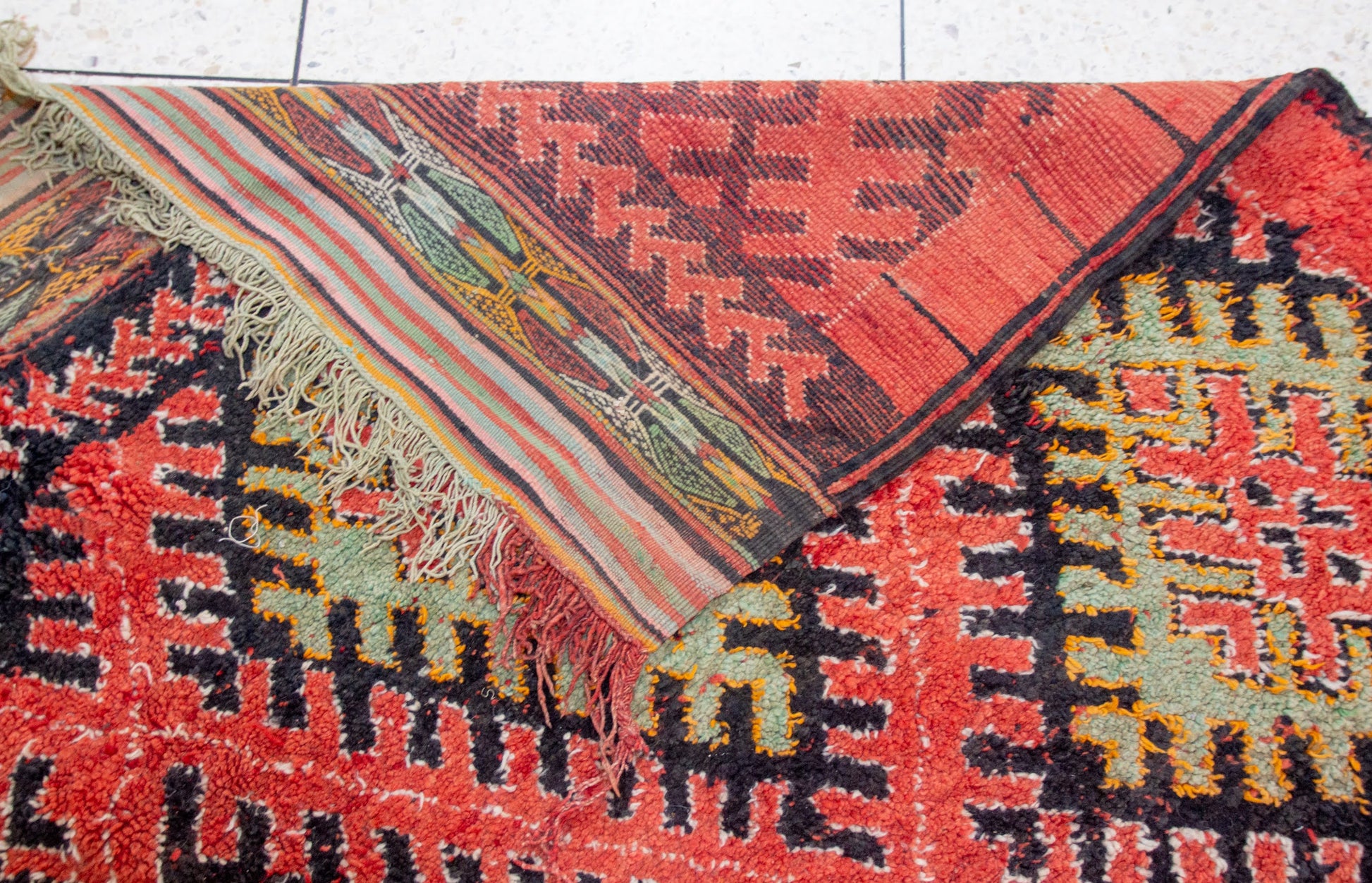 Hand-knotted wool pile with a supple, resilient handle. Medium pile reads soft underfoot; subtle abrash and a woven kilim end-finish underscore authentic Middle Atlas craft.