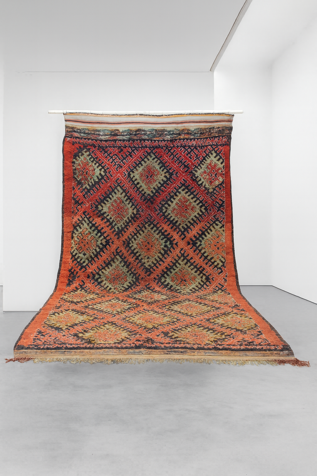 Zayane geometry at scale—nested diamonds, cross rosettes, and a warm coral field.