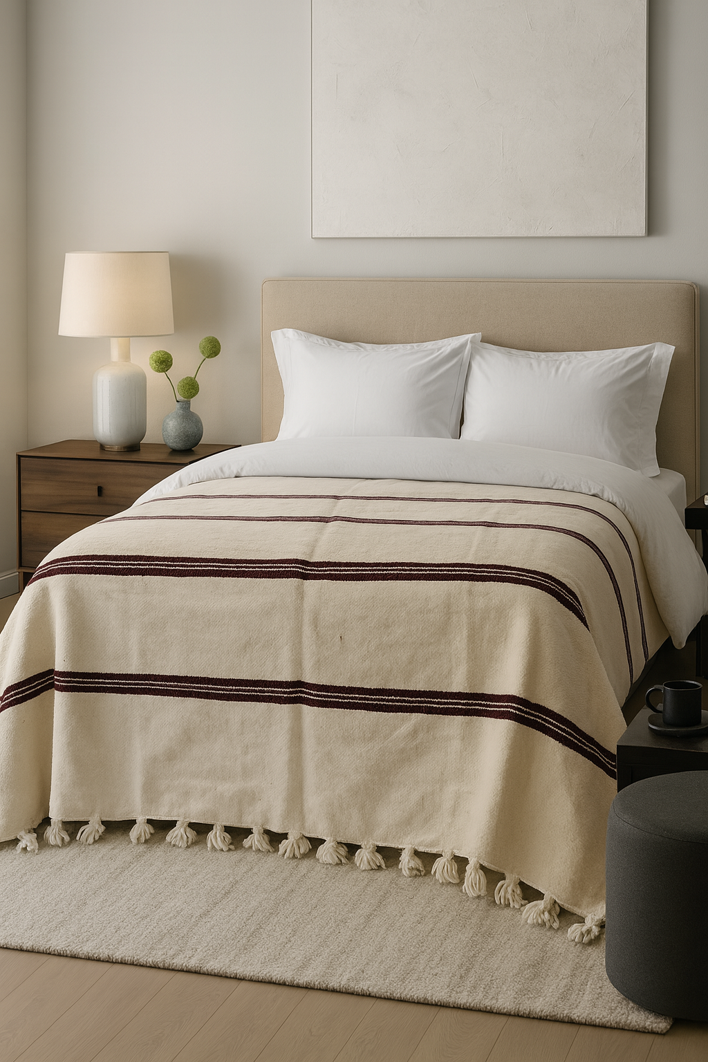 A restrained Middle Atlas hanbel blanket: an ivory field traversed by Bordeaux stripe registers with fine guard lines. The disciplined stripe language—attested across Zemmour and Zayane ateliers—foregrounds loom precision and quiet luxury for contemporary spaces.