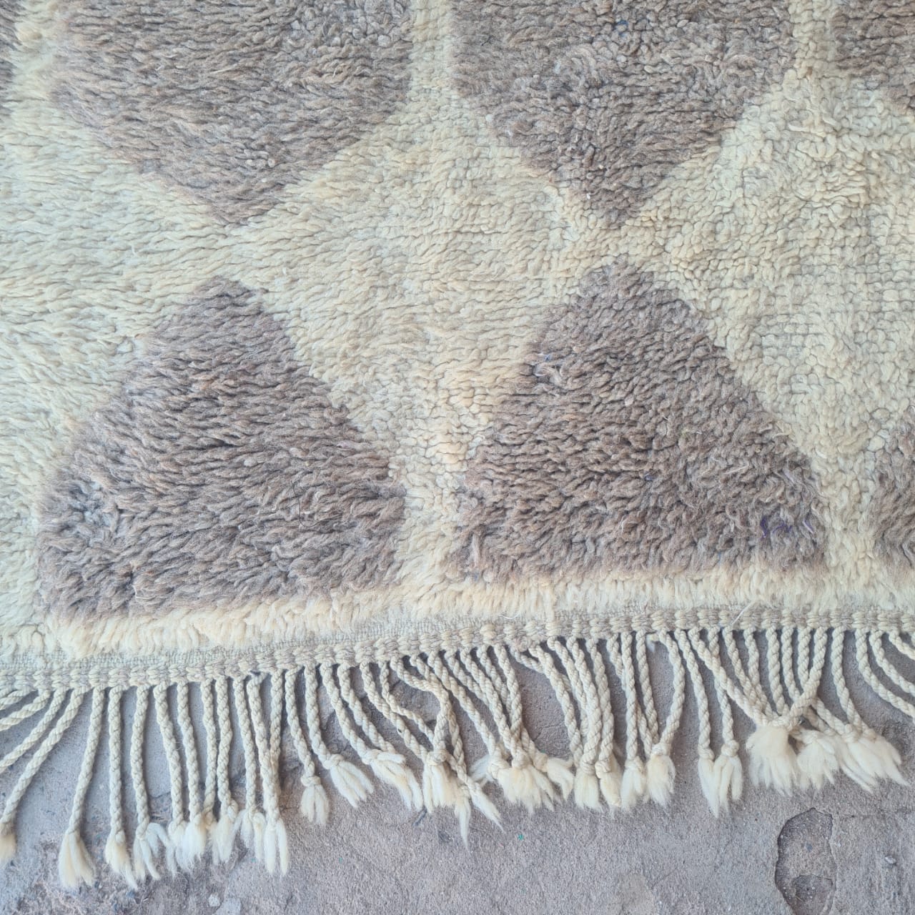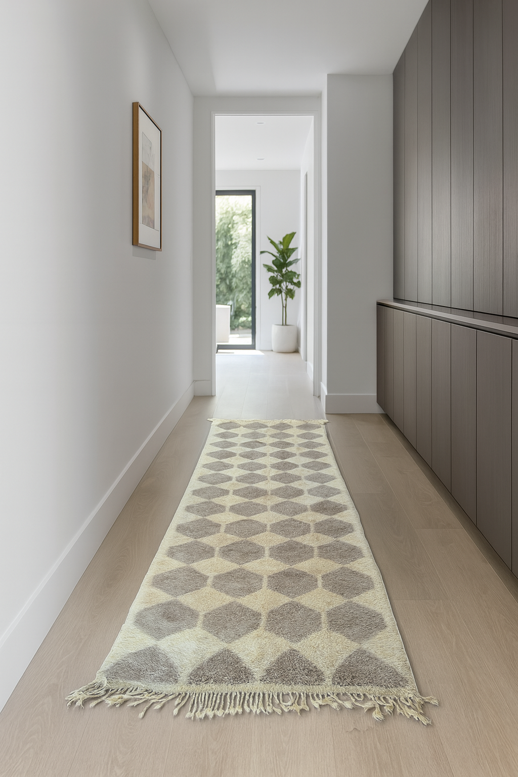 A long-format Beni Mrirt runner with rhythmic ash-grey diamonds on a natural ivory ground. Plush pile, clean geometry—an elevated corridor statement with quiet luxury.