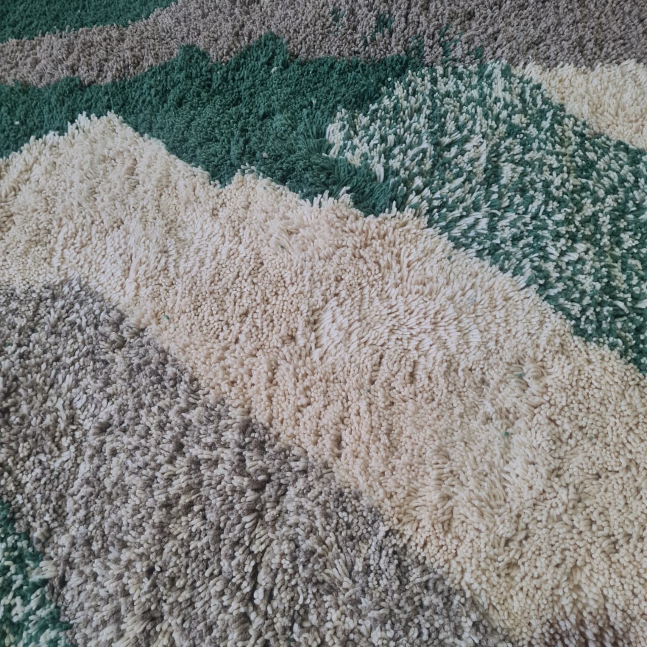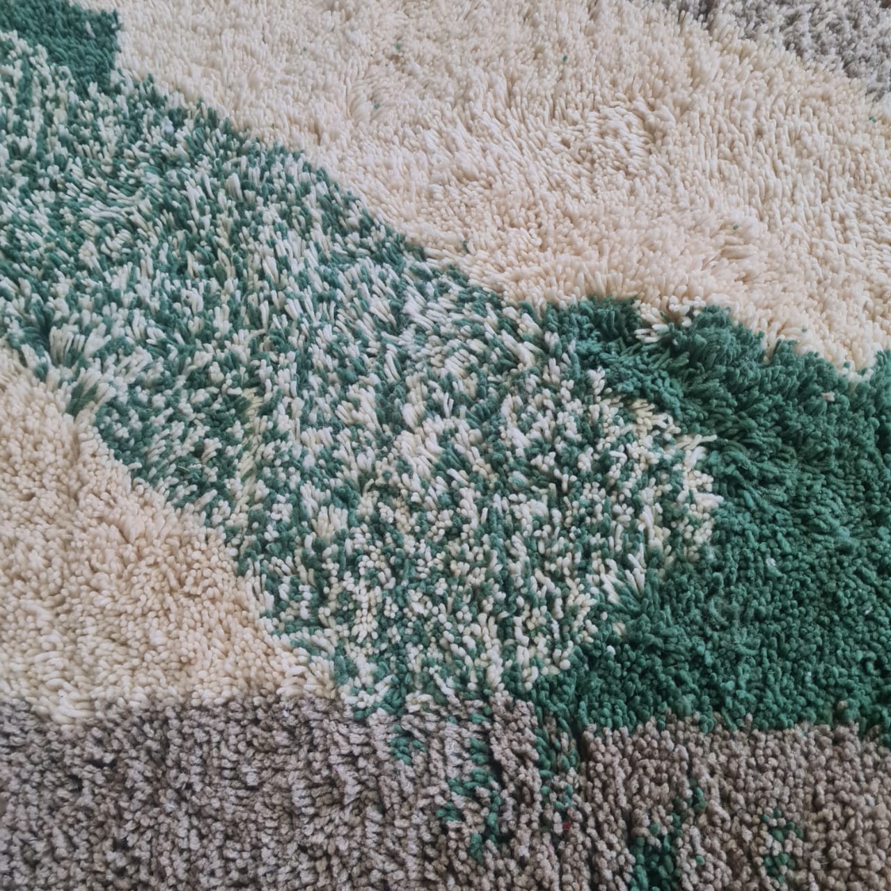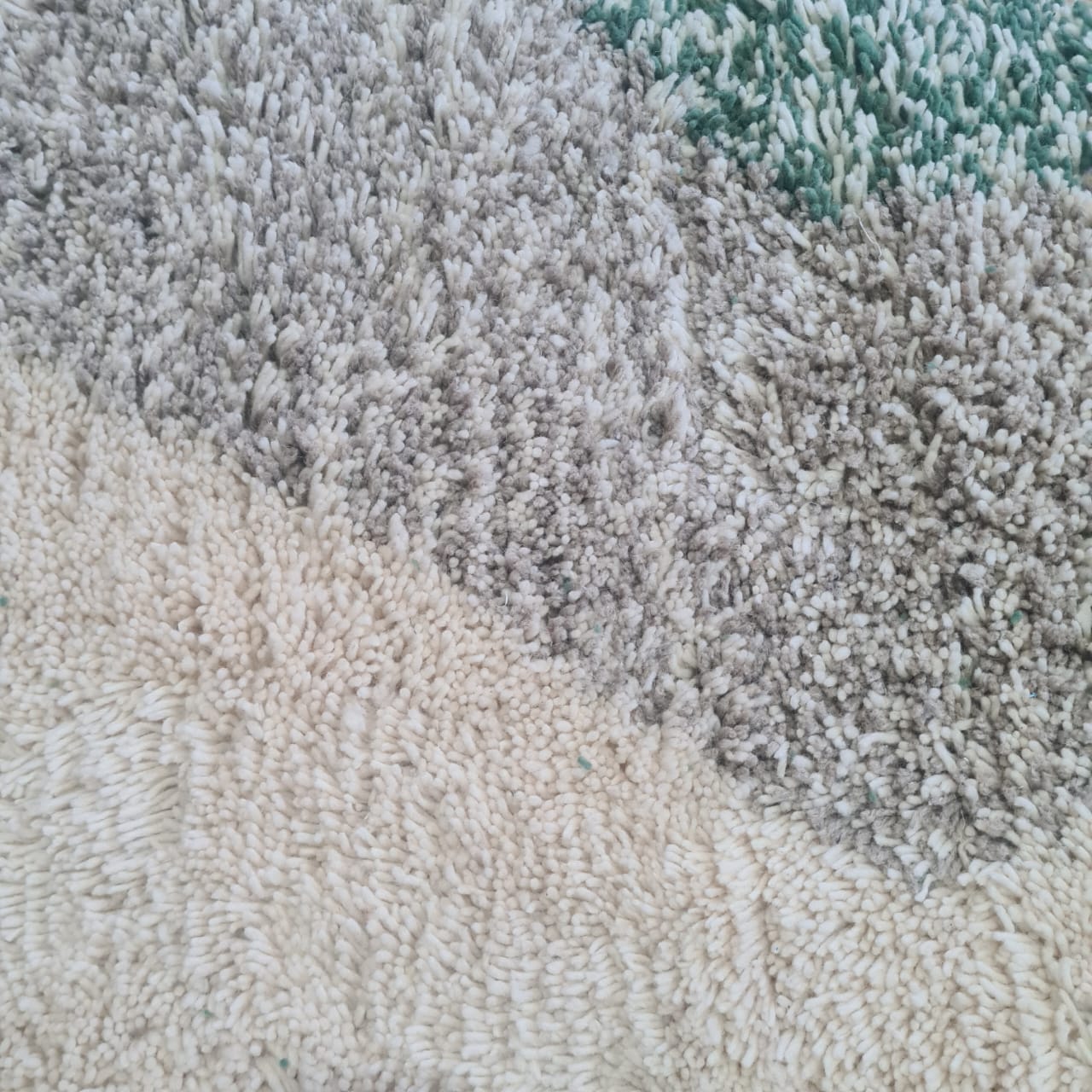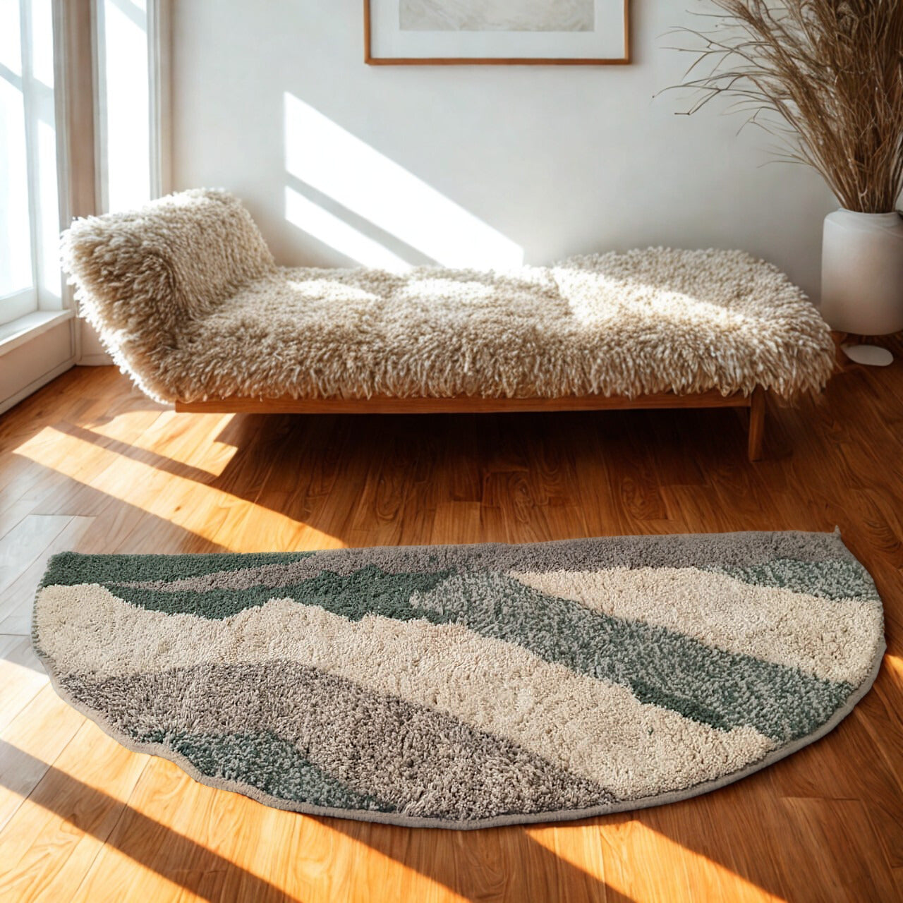 Sculptural and soft: an Azilal half-moon hand-knotted in undyed ivory with bands of moss, sage, and stone. The painterly strata sweep along the arc, delivering movement and warmth with a modern curved silhouette. A clean, bound edge (no fringe) keeps the profile contemporary and easy to place.