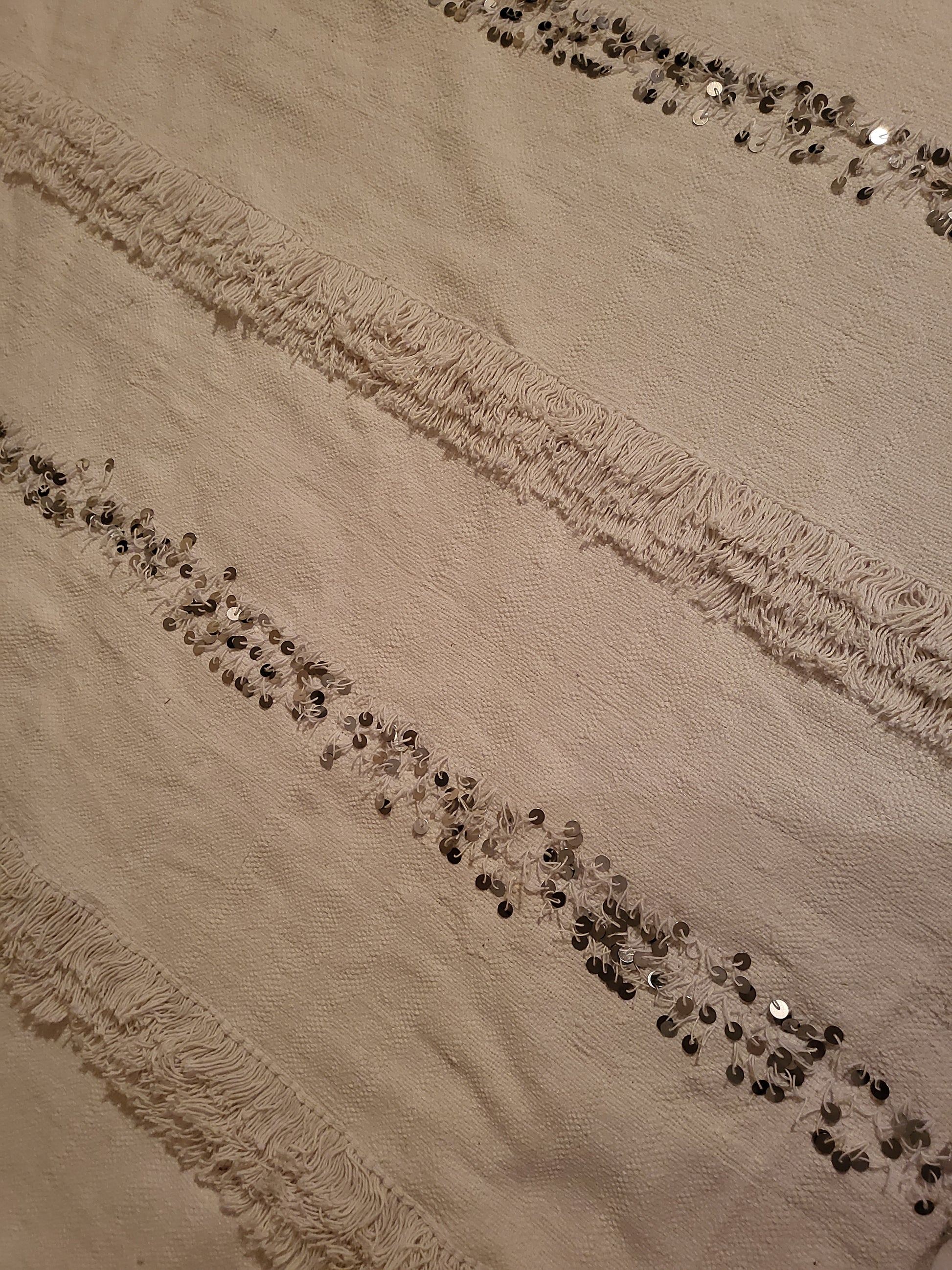 - Condition: New; minor variations in tuft height and sequin spacing are inherent to handcraft