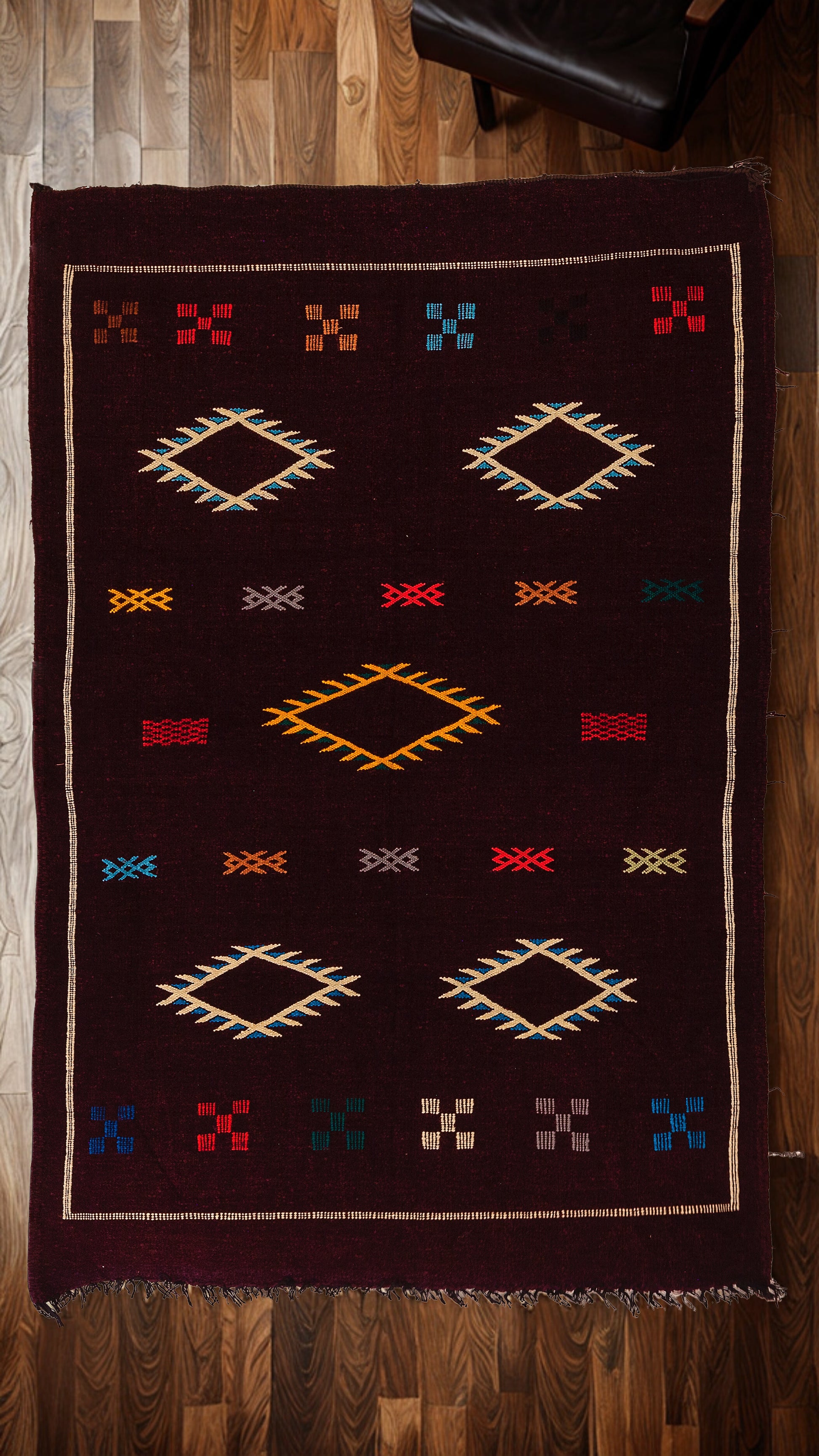 From the Boujaad plateau of the Middle Atlas, this refined flatweave sets hooked lozenges and talisman crosses against a deep aubergine field. A fine ivory inner guard line frames the composition. Woven in moubra (maker-stated local fibre) for a supple yet durable handle, it’s a low-profile kilim that slides cleanly under doors and dining chairs.