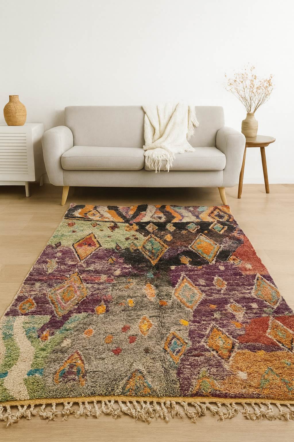 Painterly Boujaad with floating diamond talismans set in a shifting field—violet and slate melting into moss, teal, saffron and ember. A modern abstract composition rendered in plush wool, alive with abrash and depth.