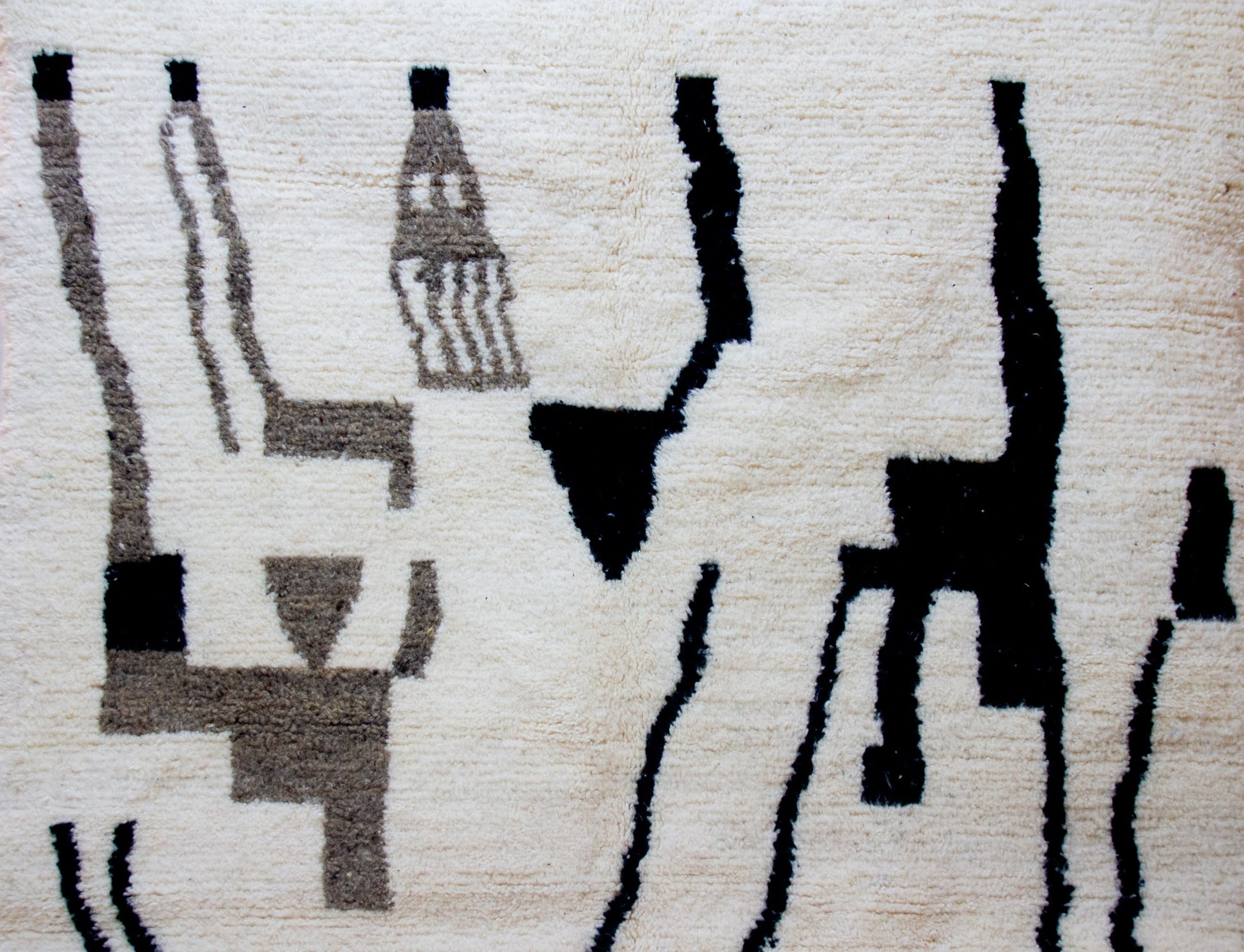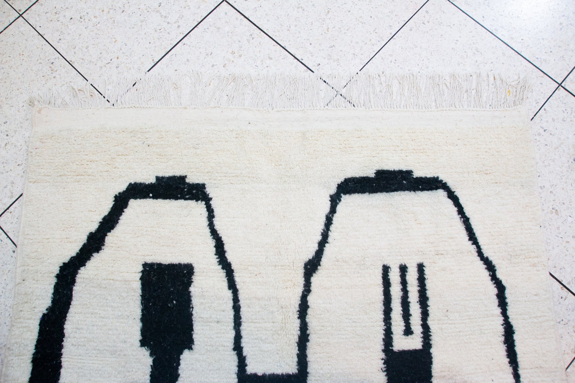 A striking Azilal rug that reads like an urban skyline rendered in wool. Deep black and soft taupe motifs rise from a luminous ivory field, forming a freeform composition of angular towers, ladders, and architectural echoes—contemporary art through an Amazigh lens.