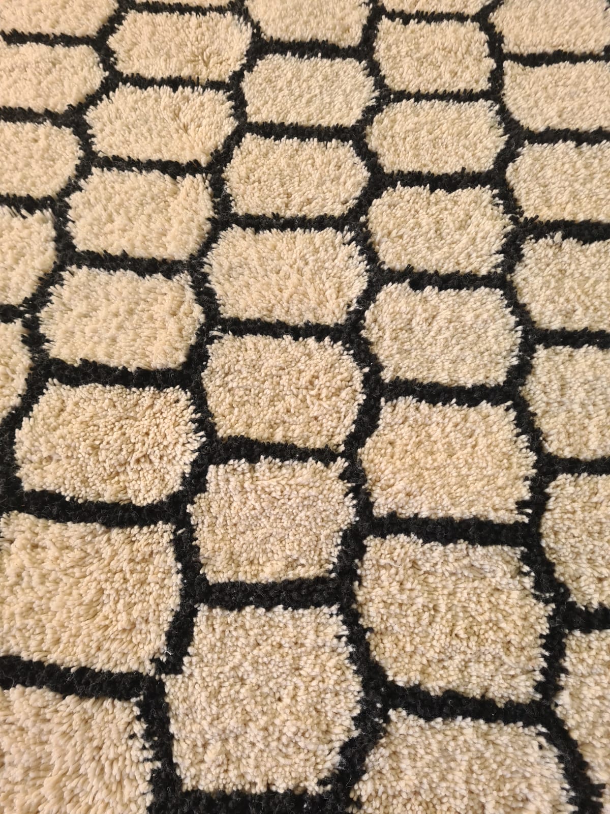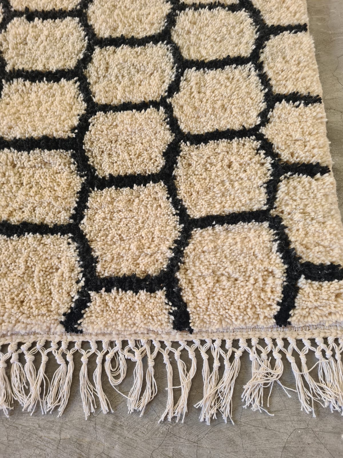 Honeycomb Pathways is a striking Beni Ourain rug, handwoven in the Central Middle Atlas, distinguished by its bold modular pattern echoing the sacred geometry of honeycomb lattices. The rhythmic black cells over a warm ivory field create a sense of equilibrium—at once structured and fluid.