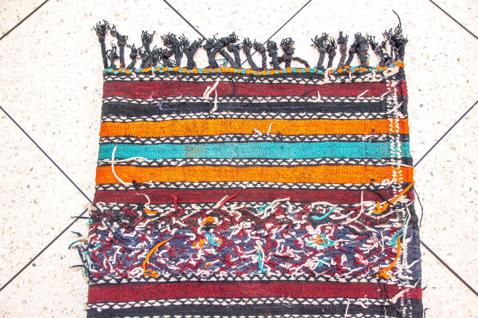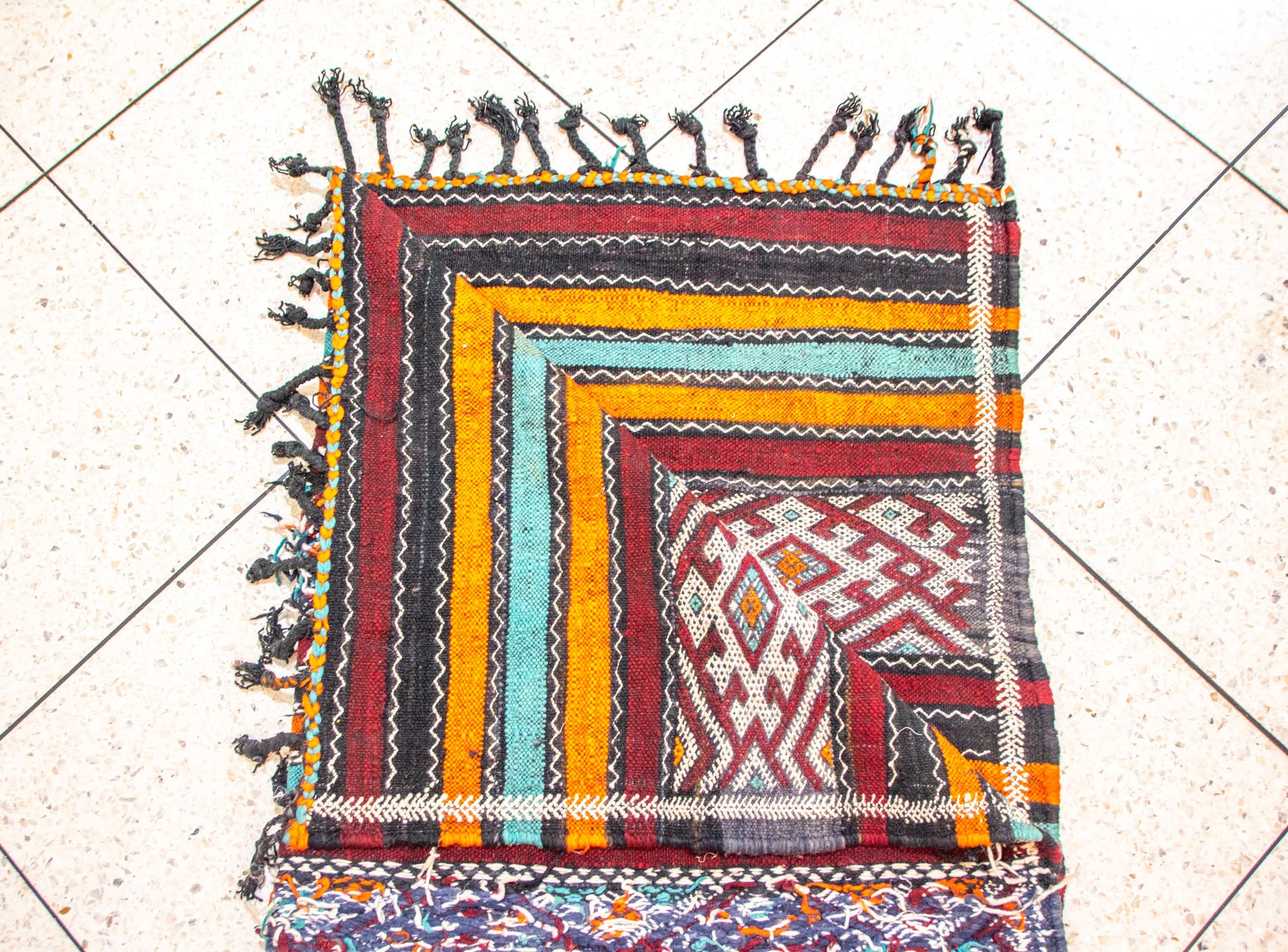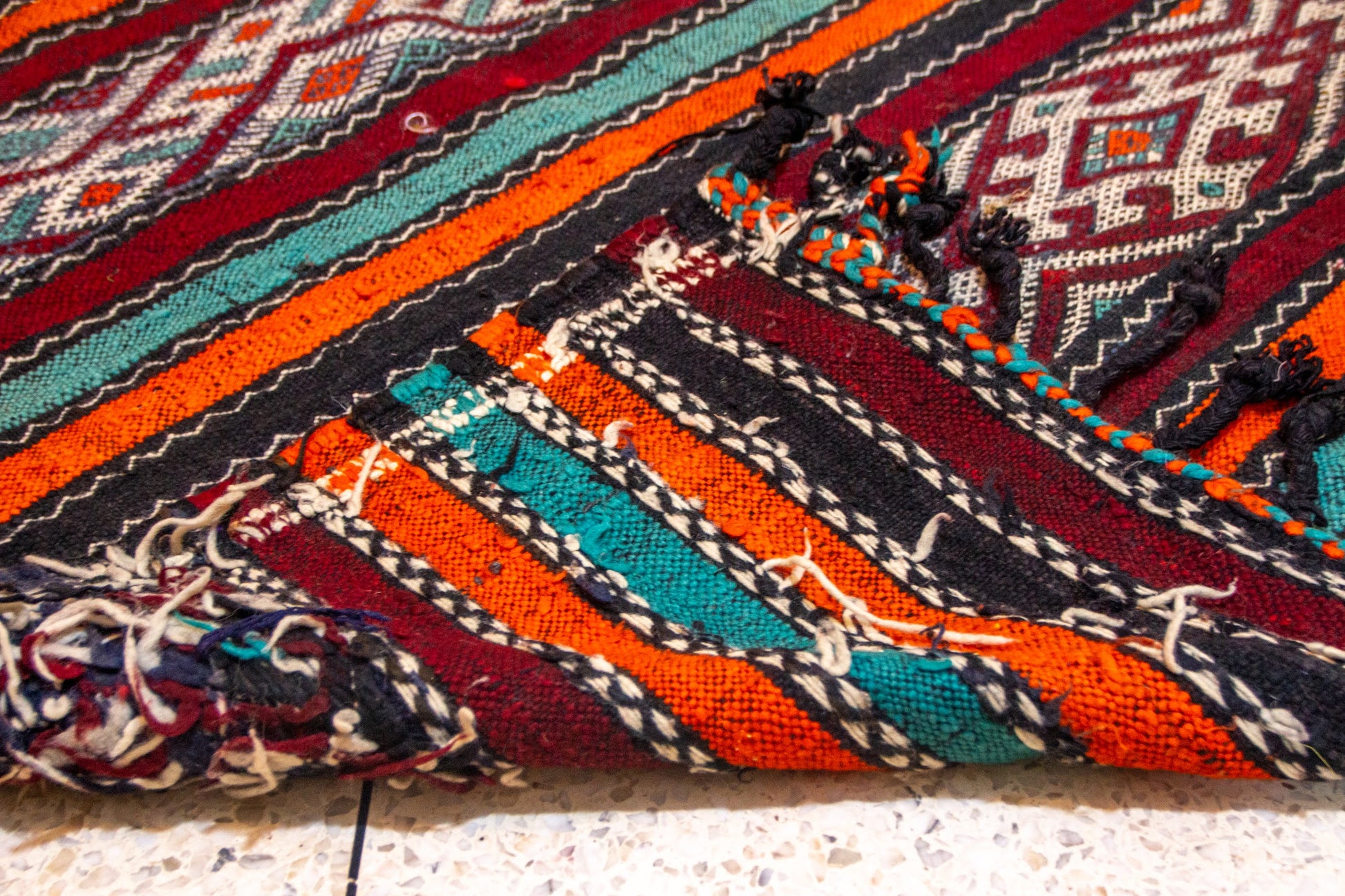 - Construction: Flatwoven kilim (henbel) with brocaded bands