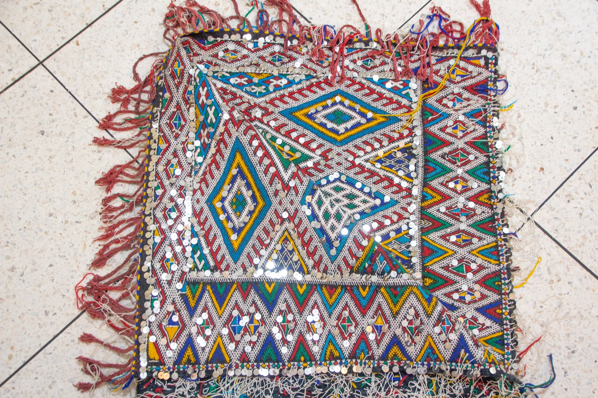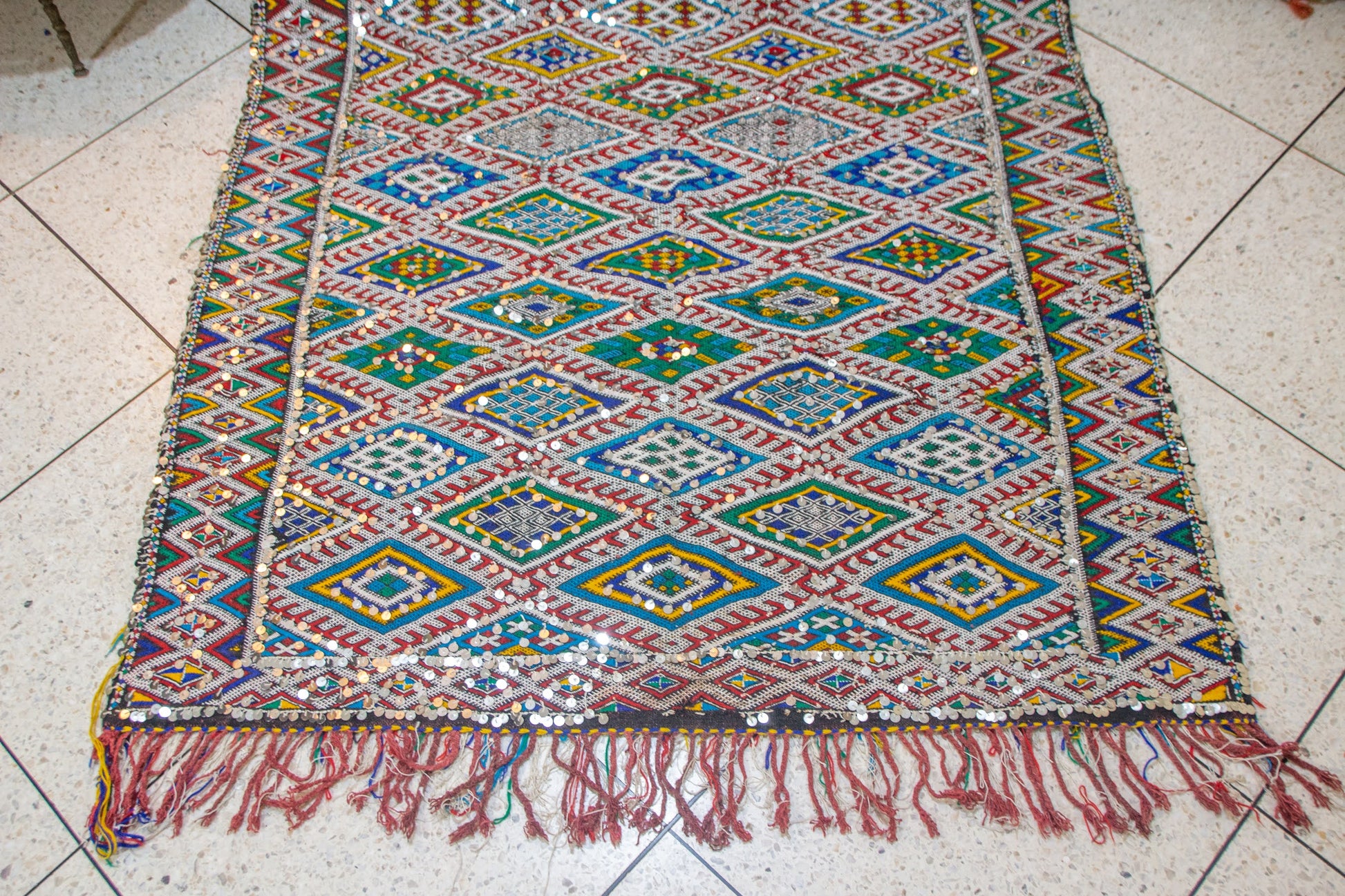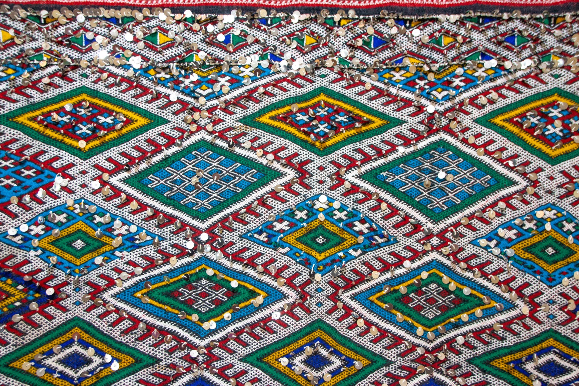 A luminous Beni Mguild henbel (flatwoven kilim) whose tight diamond lattice stages gem-like medallions in lapis, teal, saffron, and olive. Saw-tooth guards and stepped lozenges articulate the field and borders—an elegant transcription of Middle Atlas geometry in travel-light format.